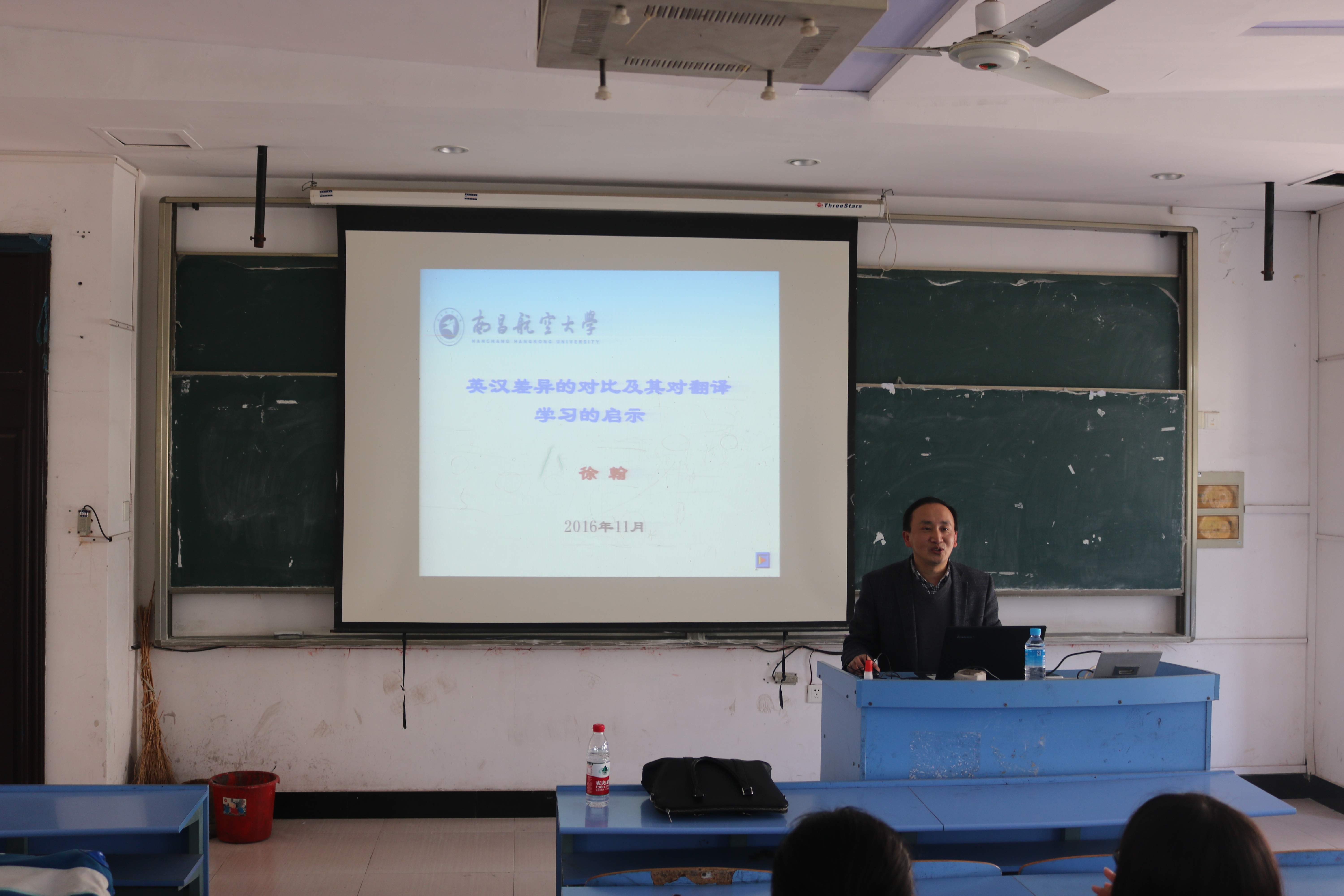 11月18日,南昌航空大学外国语学院院长、我院84级校友徐翰教授来我院做了主题为“英汉差异对比及其对翻译学习的启示”的学术讲座。讲座由学院院长袁邦株教授主持,外国语学院师生近百人参加。