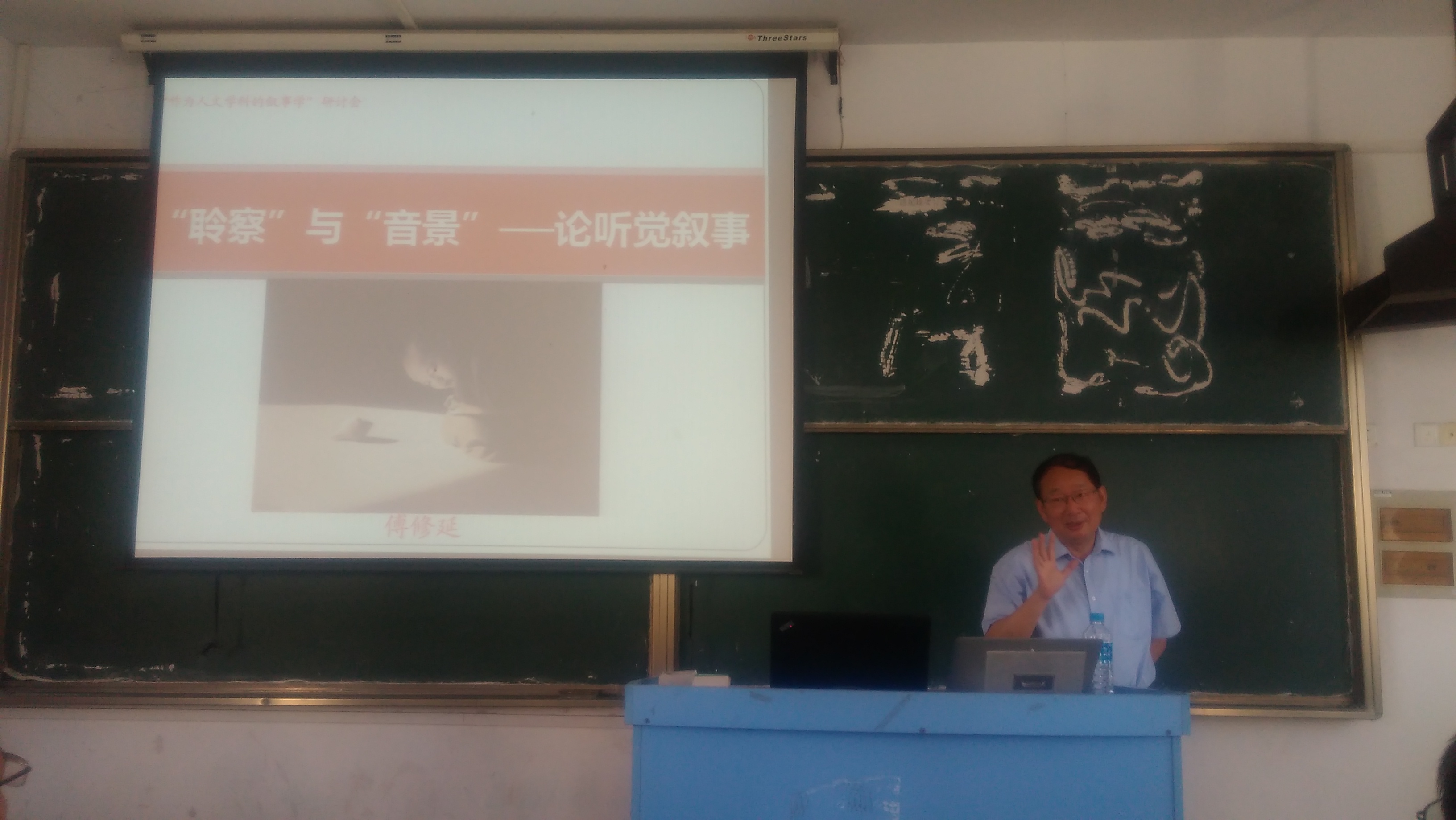 “听觉叙事”是傅修延教授目前正在主持的国家社科基金项目。在讲座中,傅教授将加拿大学者夏弗的“音景”概念引入到叙事学研究当中,从作为故事背景上声音幕布的音景、音景的反转与“声音帝国主义”的角度得以“音景”概念进行阐释,并指出了音景的不可或缺性。基于此,他提出“聆察”概念,主张通过“聆察”打开被封闭、被堵塞的听觉感知,扭转视觉霸权造成的感知失衡,帮助人们在“读图时代”重新学会安静地倾听,抵抗现代生活的喧嚣和自说自话。傅教授的讲座观点新颖,材料丰富,论证严密,不仅让与会师生了解叙事学研究的前沿领域,更让大家领略到专家学者的学识涵养与大家风范。讲座后,傅教授还与师生们就学术问题进行了热烈的交流。
