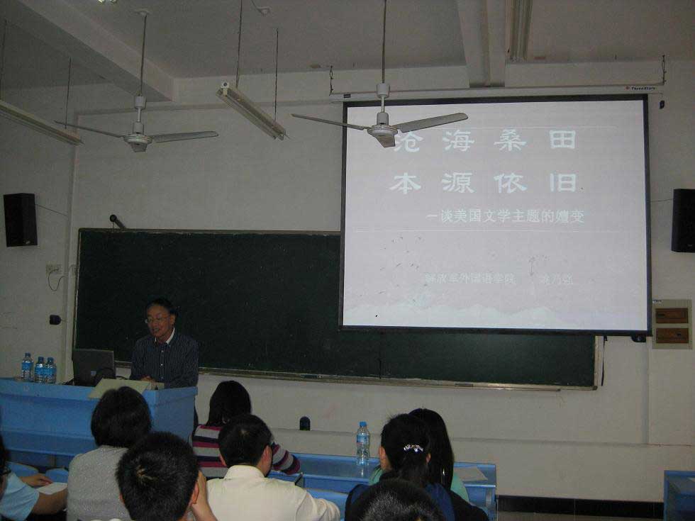 4月20日下午,解放军外国语学院博士生导师姚乃强教授应邀来我校讲学。姚教授为外国语学院教师及学生作了一场题为“沧海桑田,本源依旧——谈美国文学主题的嬗变”的讲座。外国语学院副院长袁邦株主持了讲座。