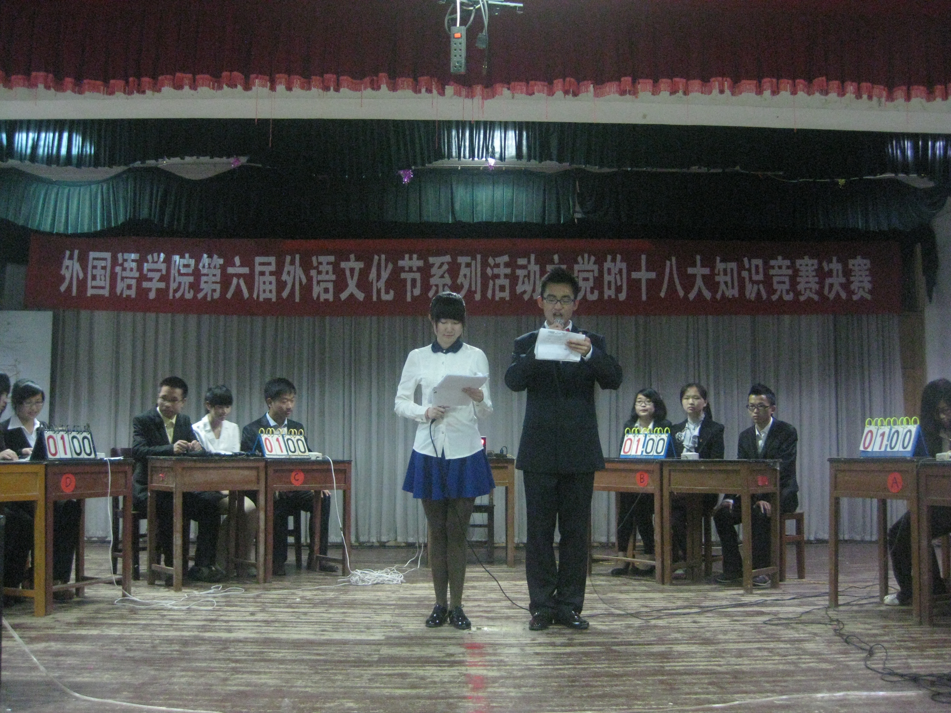 为了进一步将党的十八大精神学习活动推向深入,5月11日晚,外国语学院党的十八大知识竞赛在6栋大学生活动中心如期举行,从所有参赛的代表队中赛选出的四支学生代表队参加了竞赛,学院团委书记、学生科科长林君,200多名学生参加了竞赛活动。