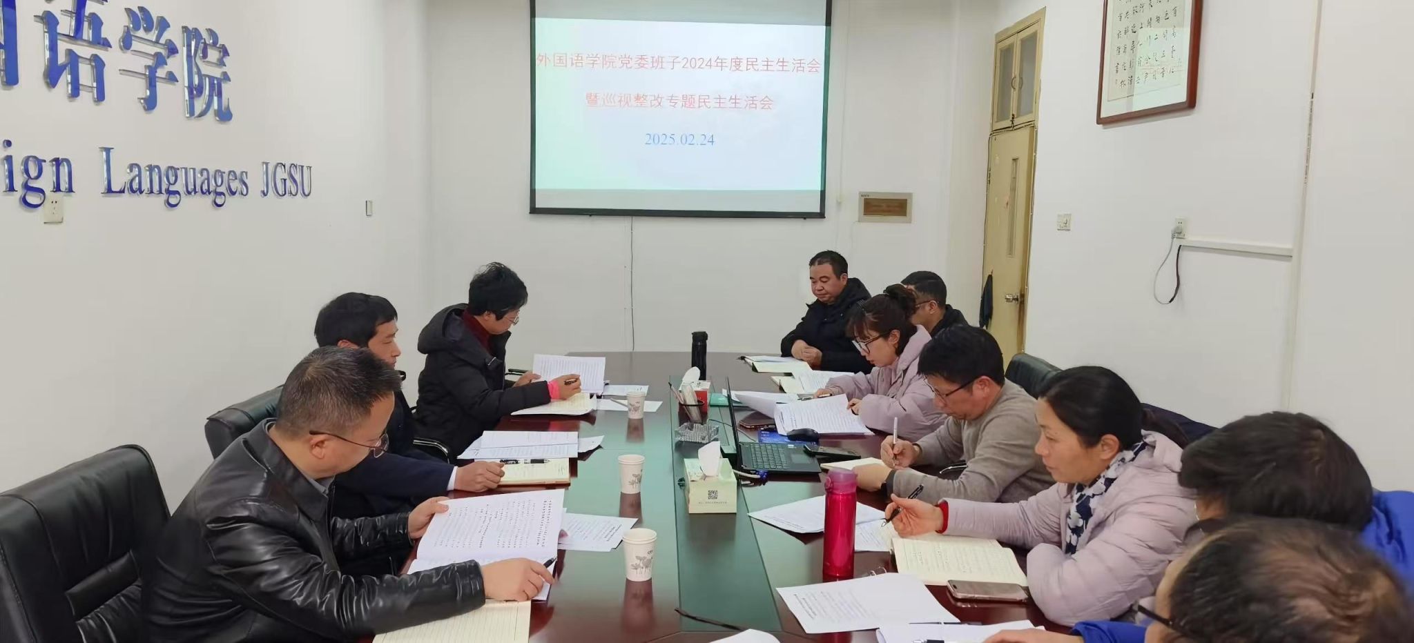 2月25日下午,外国语学院党委召开2024年度民主生活会暨巡视整改专题民主生活会。校党委常委、组织部长梁景宏出席并讲话,校督导组成员吴翔明、黄文婷到会指导。学院党委班子成员参加,3名师生党员代表列席,会议由学院党委书记胡闽华主持。