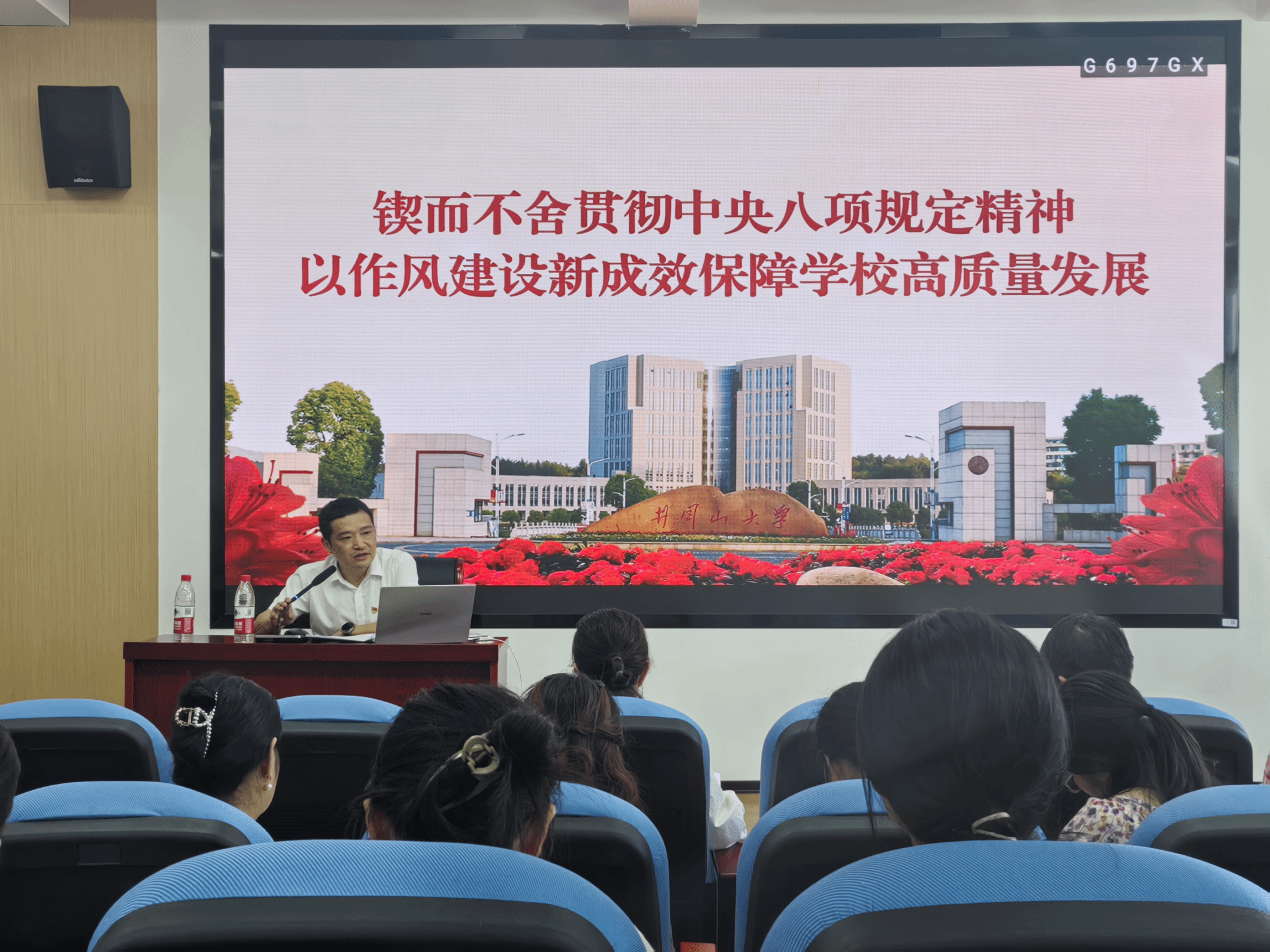 梁景宏以《锲而不舍贯彻中央八项规定精神 以作风建设新成效保障学校高质量发展》为题,从六个方面作辅导,帮助全体党员深刻把握中央八项规定精神的时代内涵与永恒价值,深刻领悟中央八项规定精神的实践伟力。