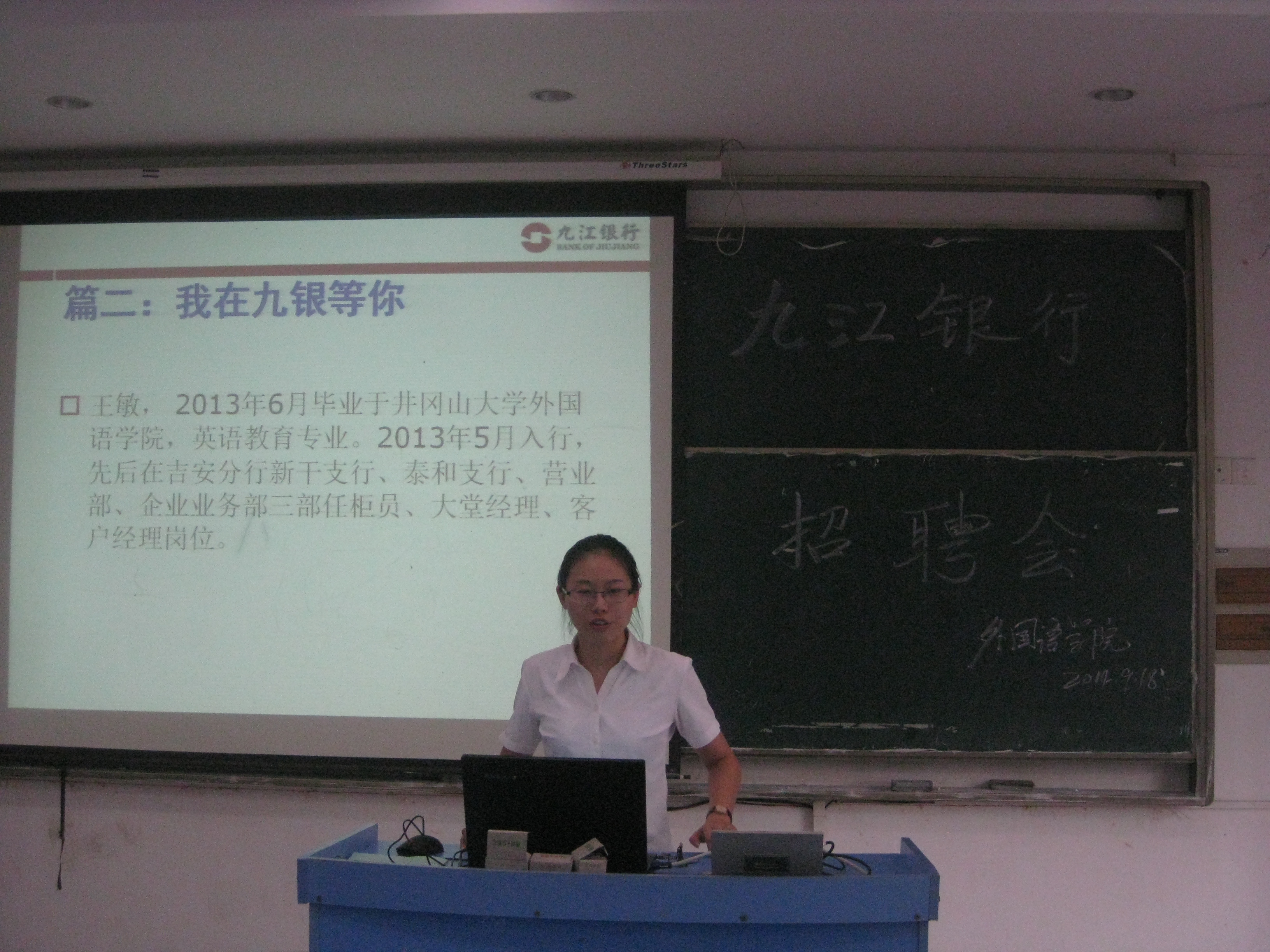 9月18日下午,外国语学院在9栋309教室顺利举办了九江银行吉安市分行专场招聘会。学院在校的百余名15届毕业生参加了此次招聘会。
