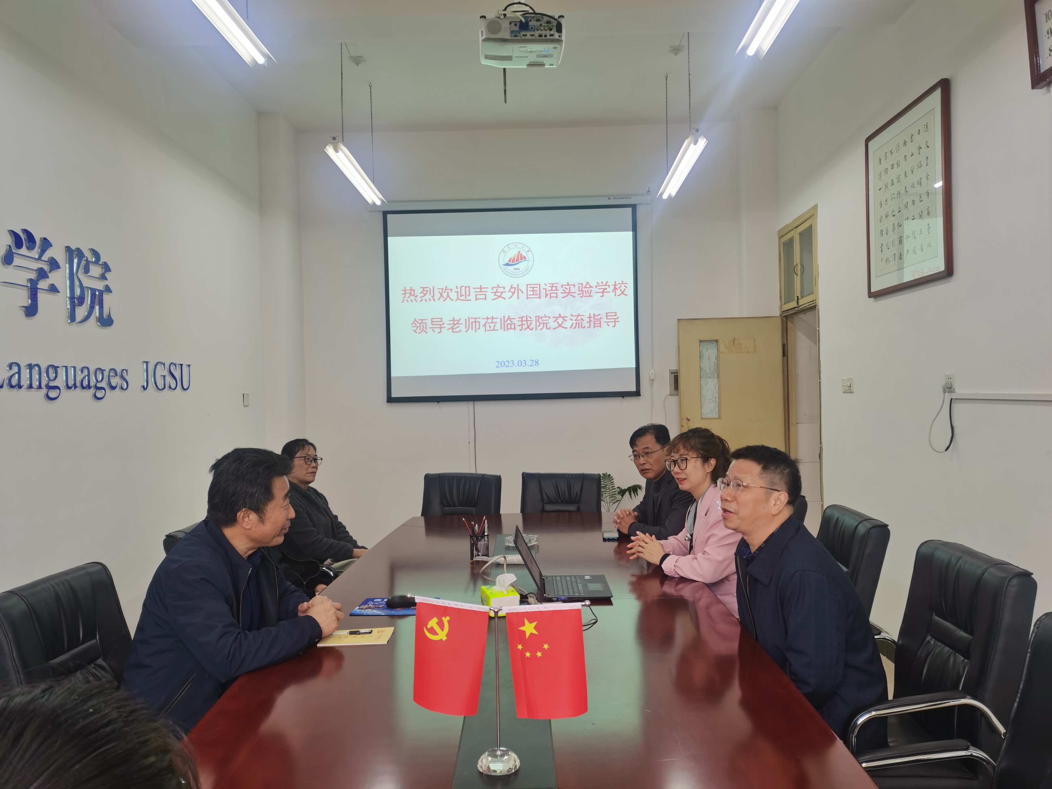 学院党委书记胡闽华、院长袁邦株与吉安外国语实验学校钟福苟副校长一行进行了座谈,就毕业生就业意愿、学校岗位需求、招聘要求等方面展开充分交流,并进一步达成学生实习基地建设意向。