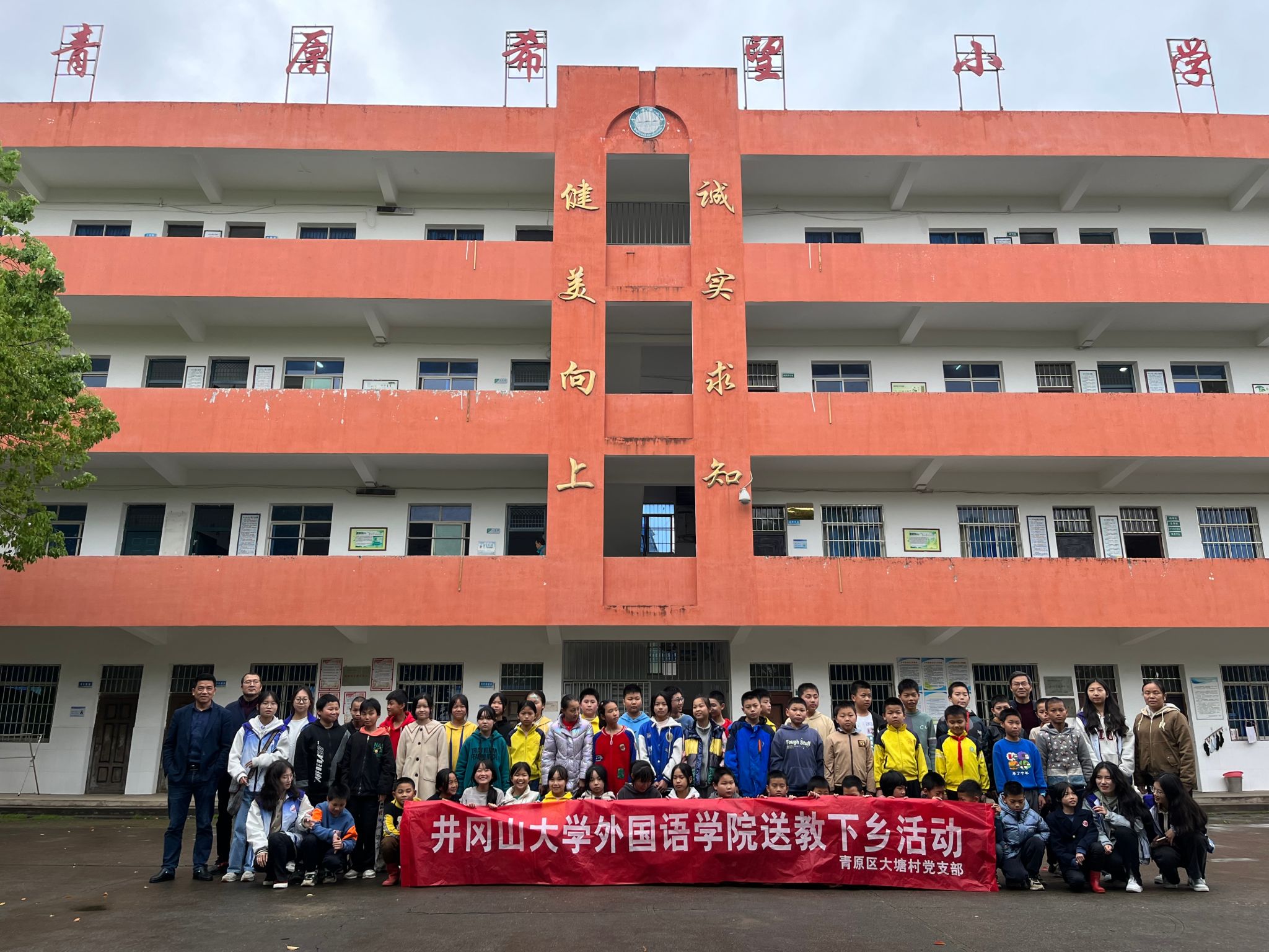 2023年4月6日下午,我院党委与青原区大塘村党支部开展党建联建活动,学院充分发挥专业优势,利用外语资源组织师生党员7人,前往青原区大塘村希望小学,开展“送教下乡”英语小课堂活动。