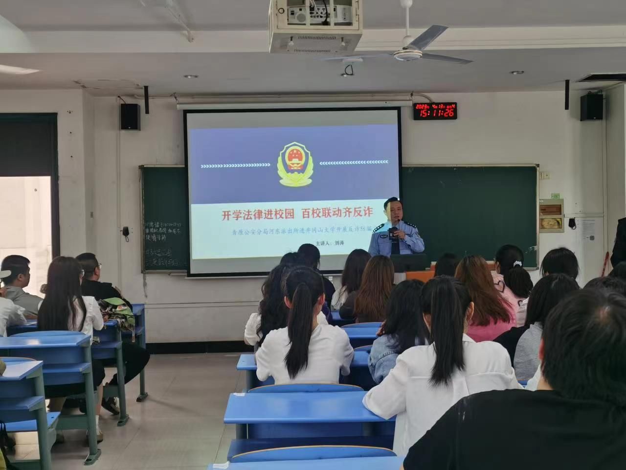 为进一步做好校园反诈骗宣传教育工作,引导学生学法、懂法、守法、用法,提升学生反诈意识和自我保护意识,营造文明、平安的校园环境。4月13日下午,我院邀请青原区公安局河东派出所民警刘涛为大一新生进行防电信诈骗宣传讲座。