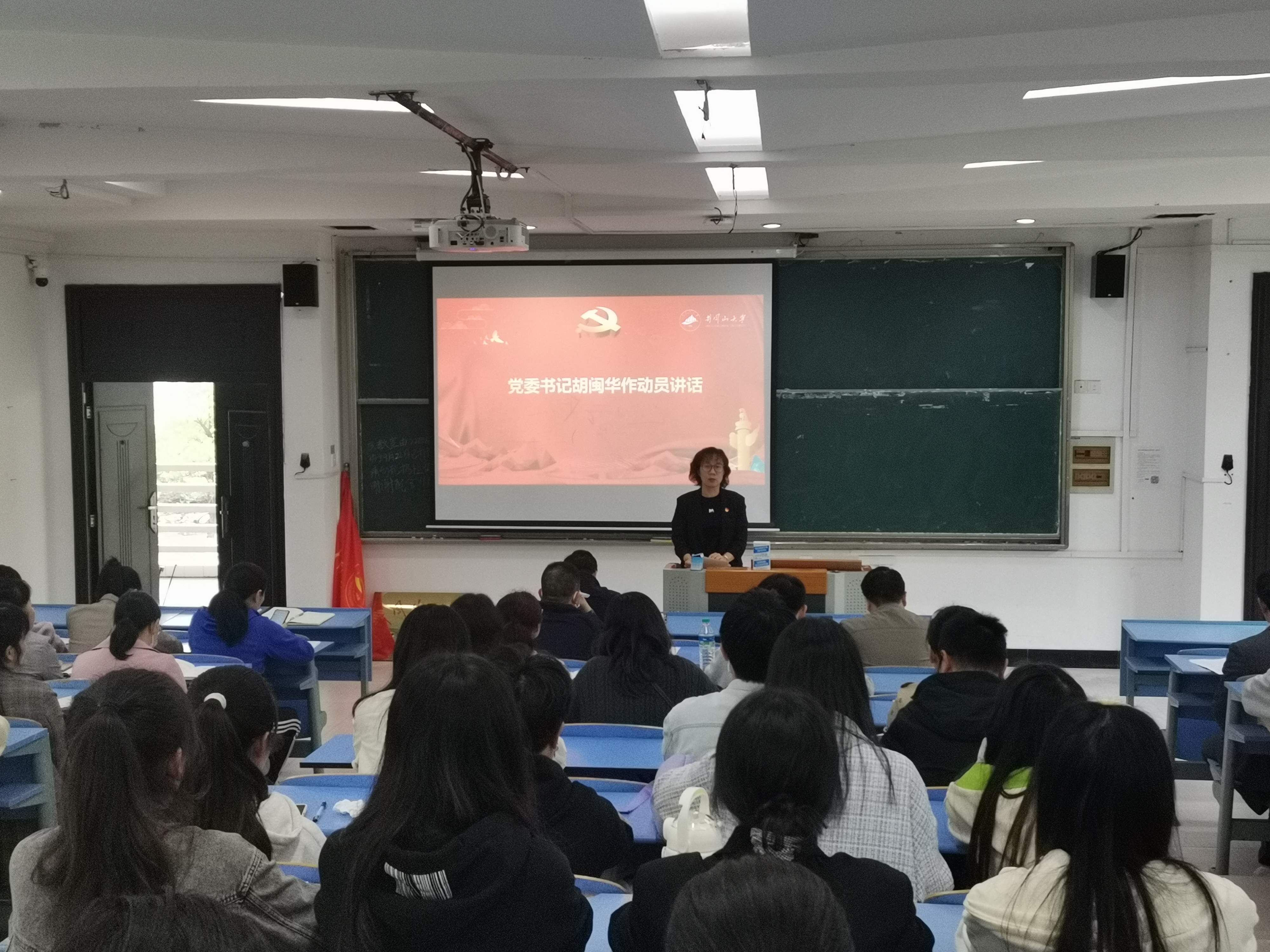 4月23日下午,我院在9栋208教室召开全院学习贯彻习近平新时代中国特色社会主义思想主题教育动员会,校党委常委、副校长肖宜安到会指导并讲话,学院党委书记胡闽华作动员讲话。院党委班子成员、各党支部书记、全体师生党员、入党积极分子、师生代表参加动员会。