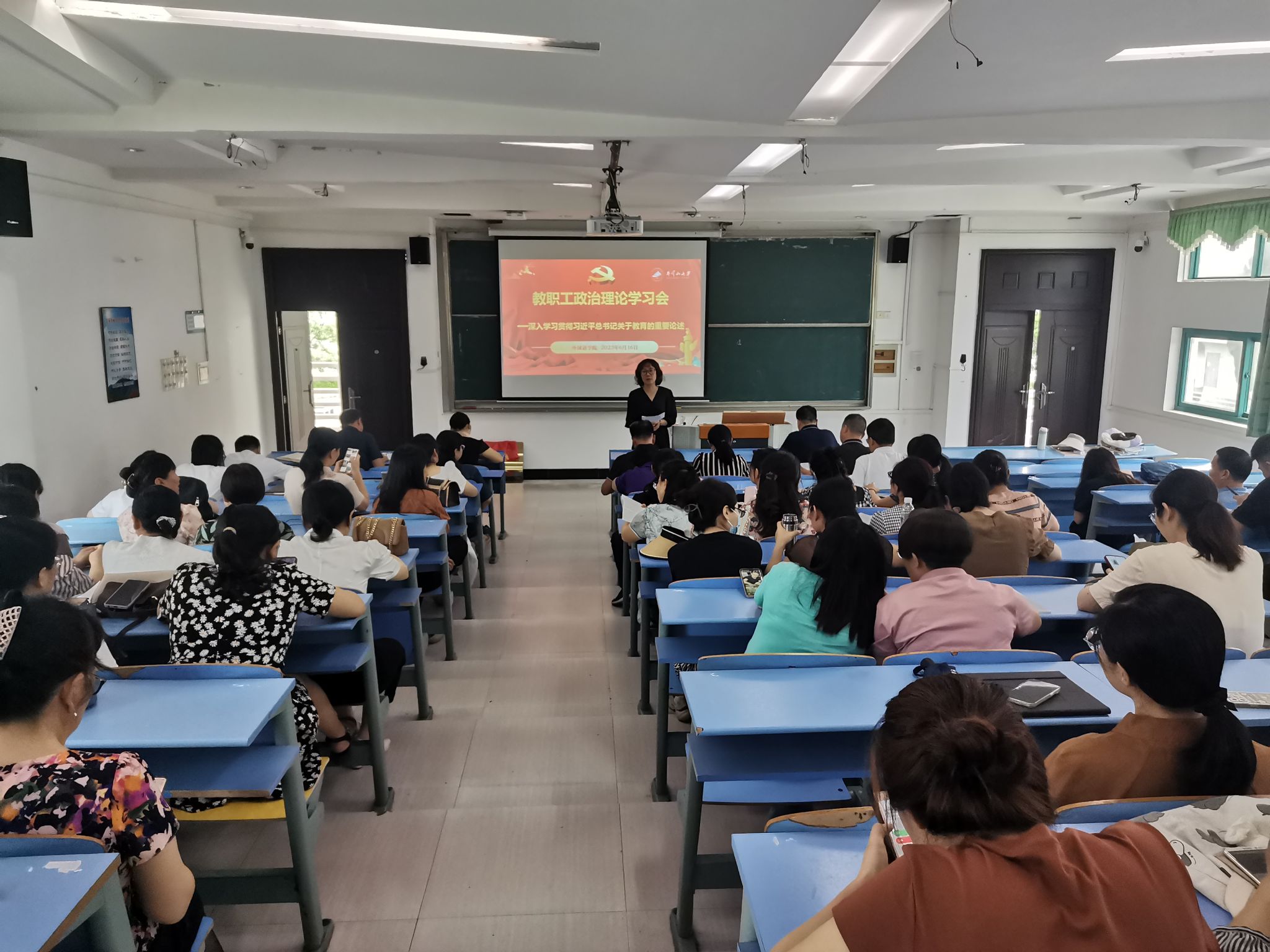 6月16日,外国语学院组织全院教职工召开政治理论集中学习会,深入学习习近平总书记的系列重要论述,开展意识形态、民族团结、师德师风、廉政教育等专题学习,推动主题教育走深走实。学院党委书记胡闽华主持会议。