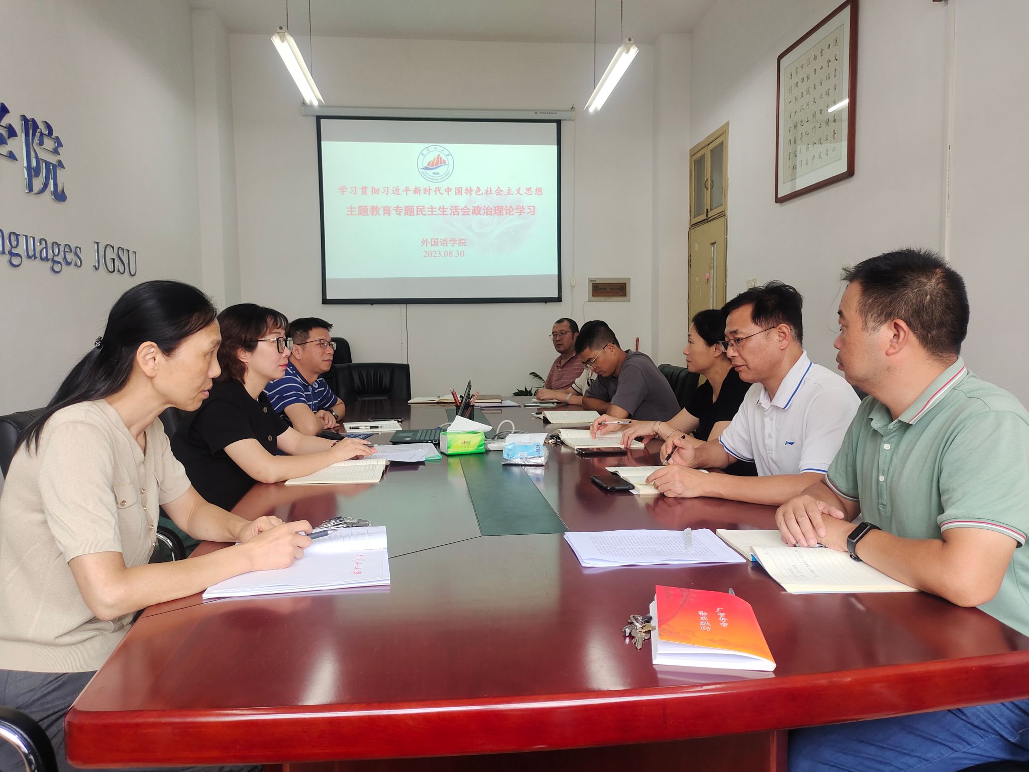 根据《外国语学院学习贯彻习近平新时代中国特色社会主义思想主题教育专题民主生活会方案》要求,为开好主题教育专题民主生活会,8月30日上午,学院党委理论学习中心组深入开展学习贯彻习近平新时代中国特色社会主义思想主题教育政治理论专题学习。会议由学院党委书记胡闽华主持,学院党委理论学习中心组成员参会。