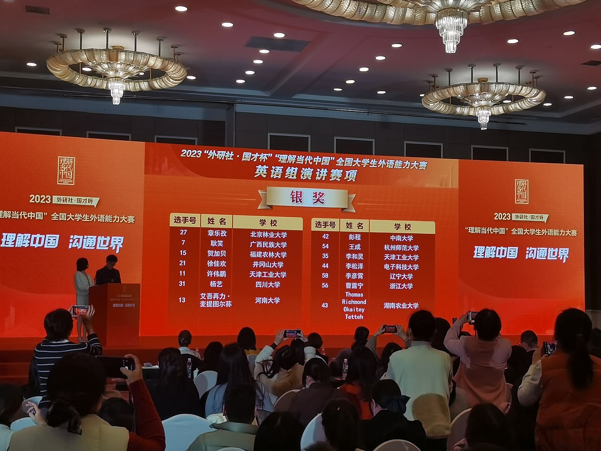 我校在江西省复赛中脱颖而出、获得金奖的五位选手晋级国赛。在国赛过程中,面对来自全国各个高校的优秀选手,我校学子人文学院22级汉语言专业的徐佳欢、外国语学院21商英班孙珍珍、20商英班彭琳琦、张振宇、20西班牙语班陈巧5位同学沉着镇定、思维敏捷,展现了丰富的知识储备和优秀的临场发挥与应变能力,斩获国家级银奖1项、铜奖4项,创我校参加该赛事以来获奖数量新高。外国语学院教师刘素芳、李朝华、罗艳、朱景华、彭羽婷和王秀娟等6名教师获优秀指导老师。