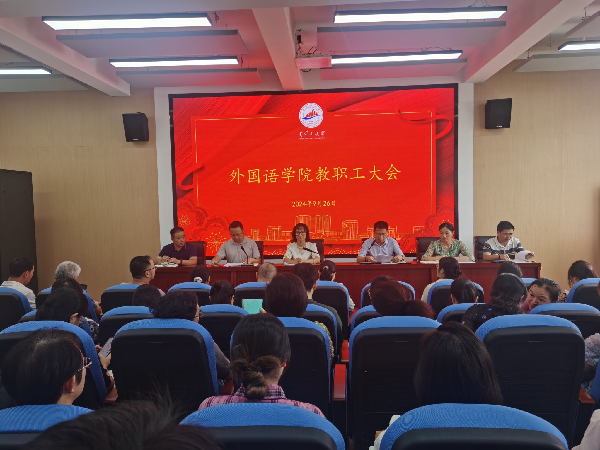 9月26日下午,外国语学院召开秋季开学教职工大会。大会由院长袁邦株主持,全体院领导和教职工参加了会议。