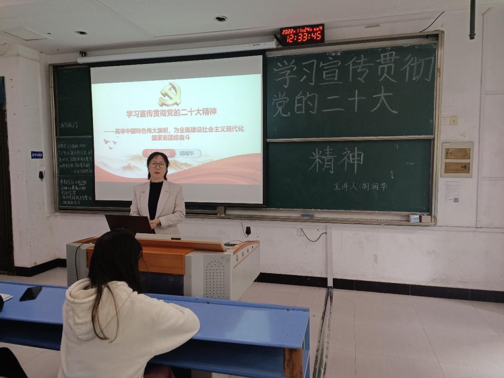 胡闽华围绕党的二十大的重要意义、党的二十大主题、新时代下中国共产党的使命与任务、教育科技人才兴国、坚持全面从严治党等五个方面进行宣讲,帮助学生加深对党的二十大精神的理解。