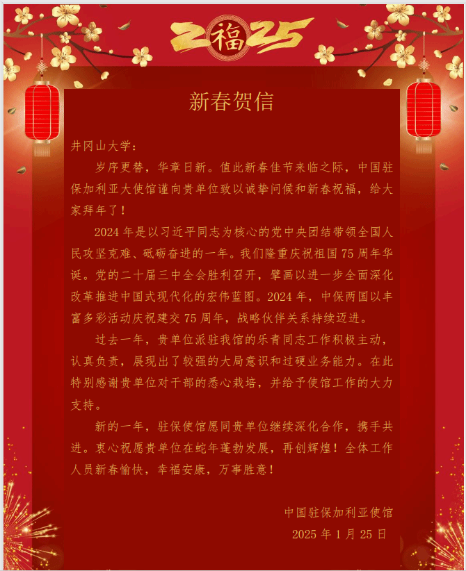 中国驻保加利亚大使馆新春感谢信(井冈山大学)