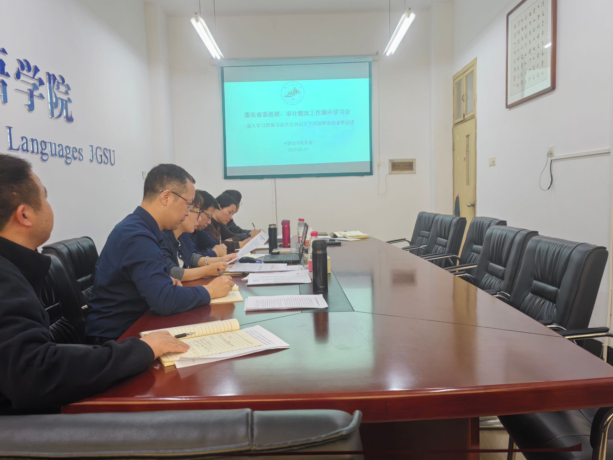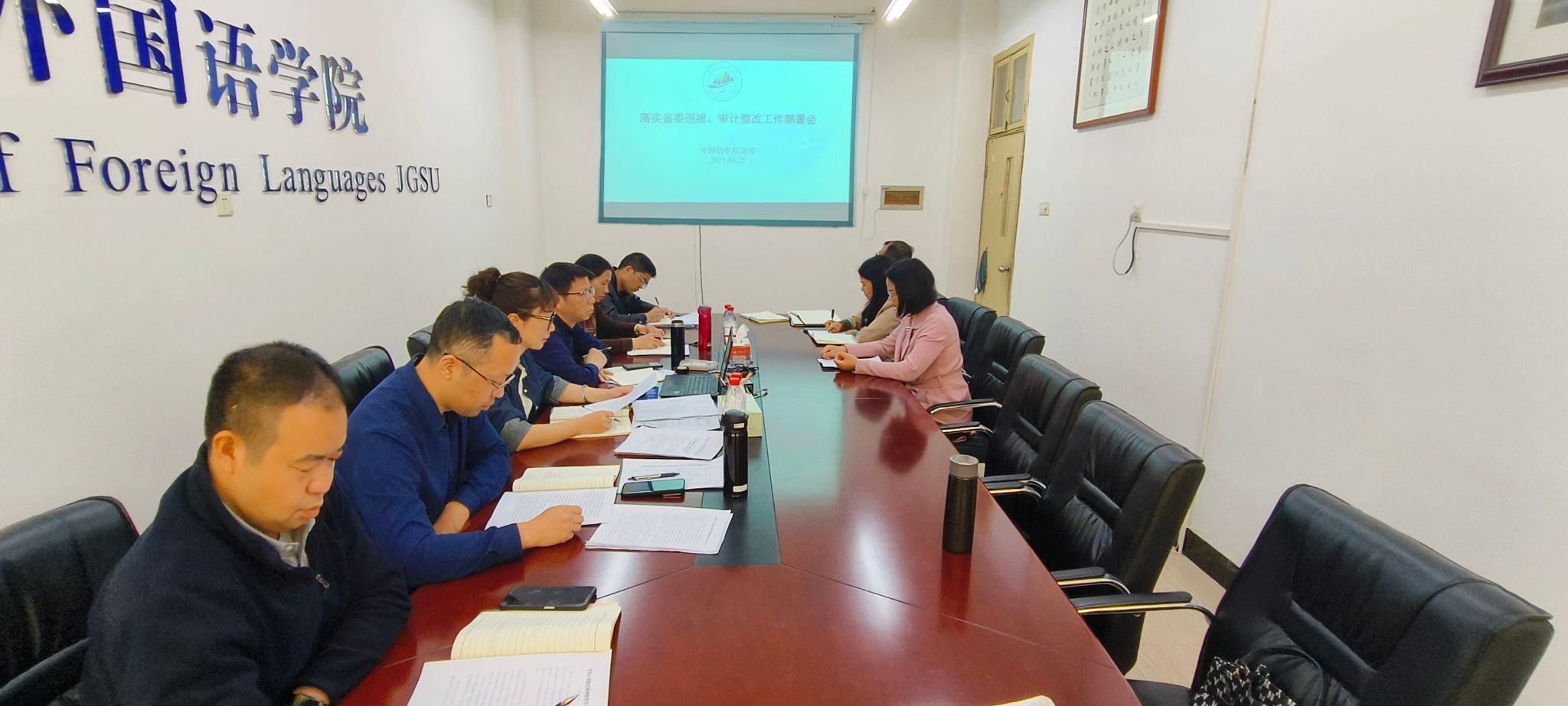 3月25日上午,外国语学院召开落实省委巡视和审计整改工作部署会,深入学习贯彻习近平总书记关于巡视和审计工作的重要指示精神,全面部署整改任务,落实责任,全力以赴做好审计发现问题整改。会议由党委书记胡闽华主持,全体处级领导、相关责任科室负责人参加。