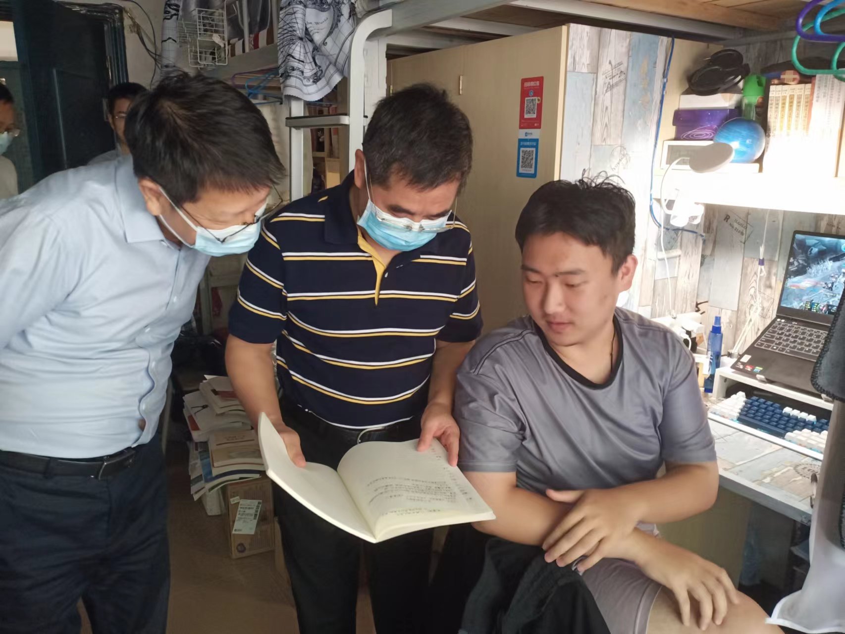 肖宜安来到19德语班学生寝室,同学们主动汇报线上上课的感受、参与疫情防控的体会、封闭管理下的生活状态等,并纷纷递上他们的课堂笔记请校领导翻阅指导。满满的正能量赢得肖宜安的多次称赞。