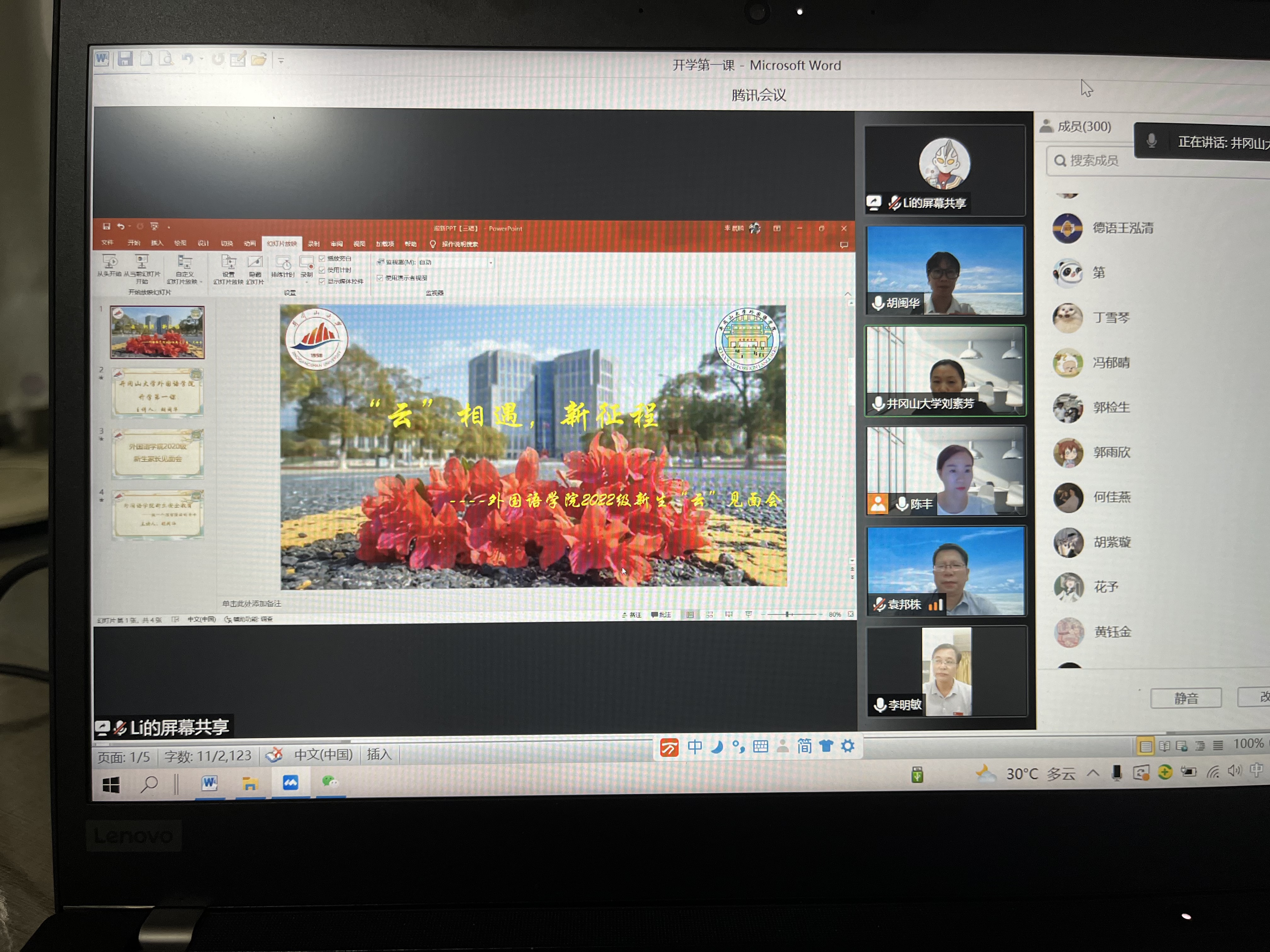 见面会分开学典礼和专业导论两个阶段。通过一段“云”游校园微视频拉开了开学典礼的序幕,新生和家长们在学姐的带领下,线上畅游井大,打卡各景点和教学楼,领略井大校园的美丽。全体院领导集体与新生见面并致词,6位优秀校友“云链接”见面会为新生分享他们在井大的生活并送上祝福。22级英教4班陈歆冉同学代表全体新生发言,表达了砥砺前行的决心,她将与全体新生并肩前行,一起向未来,拥抱美好的大学生活。