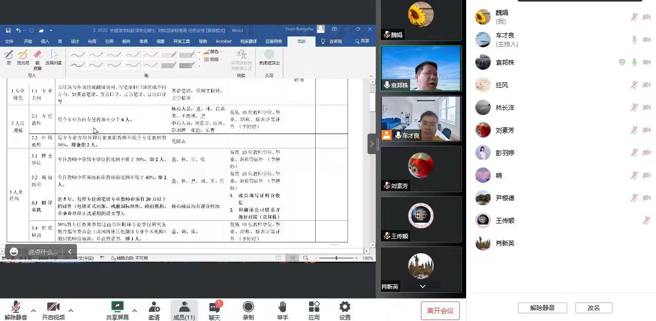 为进一步推动翻译学科建设,为申硕工作打好坚实的基础,高效促进翻译学科申硕点尽早达成国务院学位委员会硕士学位授权点基本条件,我院于9月12日下午以线上会议形式召开翻译学科申硕工作推进会。部分院领导和全体翻译学科成员、学科秘书参加了会议。
