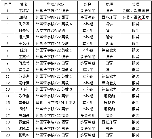 11月1日—2日,由江西省高等教育学会、外语教学与研究出版社主办,江西省外语学会、江西省大学外语教学研究会协办,江西中医药大学承办的2025“外研社·国才杯”“理解当代中国”全国大学生外语能力大赛江西省赛在江西中医药大学湾里校区举行。在师生共同努力下,我校学子凭借扎实的基本功和优异的表现在大赛中喜获佳绩,共荣获奖项20项,其中金奖2项,银奖7项,铜奖11项,创我校参加该赛事以来最好成绩和奖项数量之最。其中,外国语学院学生王甜甜和田晓妍力克群雄,分别在多语种组德语和西班牙语两个赛项中斩获金奖,顺利晋级国赛。