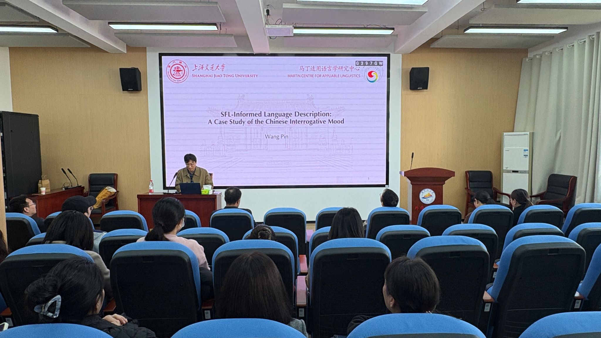2025年12月11日,上海交通大学外国语学院副教授、硕士生导师王品博士应邀为我院师生举行题为《系统功能语言学视阈下的语法描写——以语气系统为例》的学术讲座,40余名师生到场聆听。