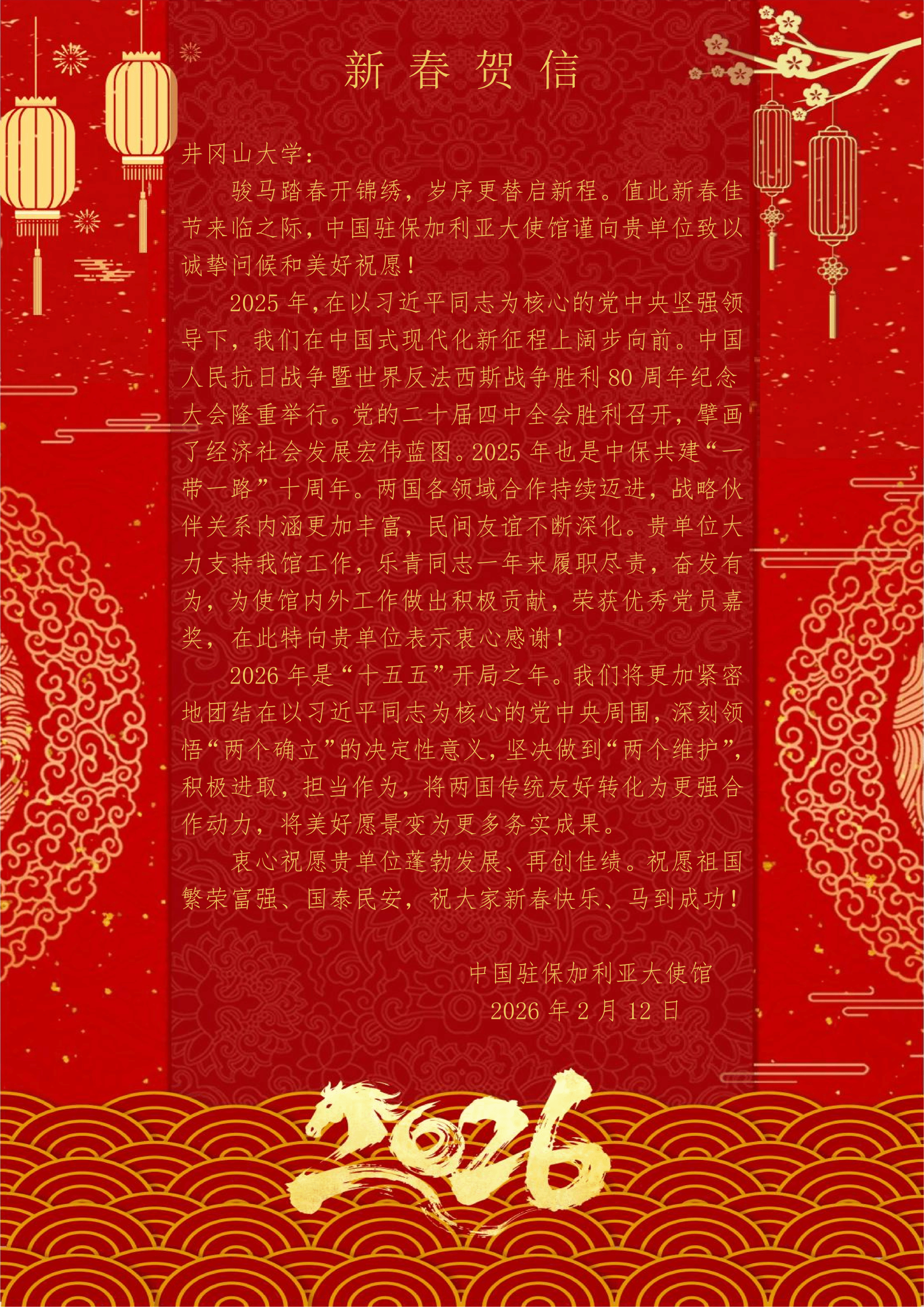 农历丙午新春前夕,中国驻保加利亚大使馆向井冈山大学发来新春贺信,向全校师生致以节日问候和美好祝愿。贺信对我校大力支持使馆工作表示衷心感谢,并高度肯定我校外派干部、外国语学院乐青同志在使馆工作期间的突出表现,特授予其优秀党员嘉奖。