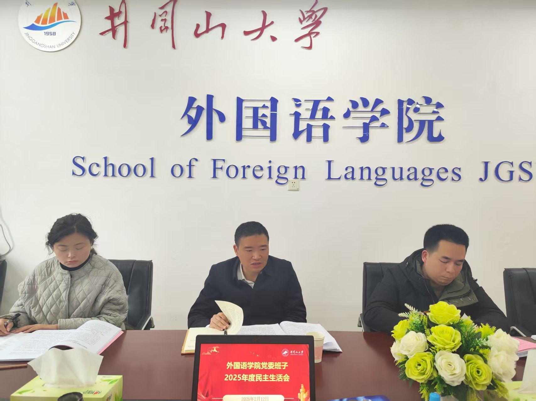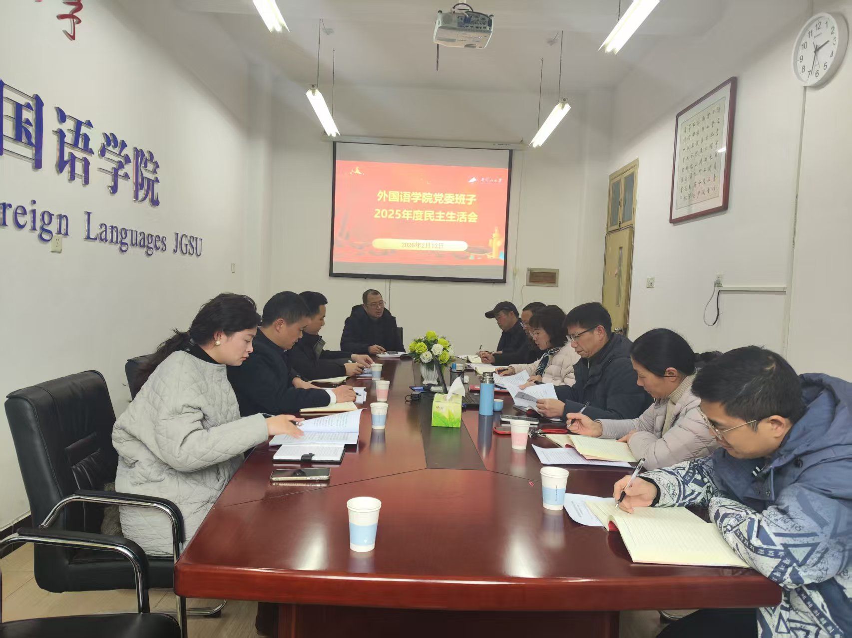 2月12日下午,外国语学院党委班子召开2025年度民主生活会。校党委常委、组织部部长梁景宏和校督导组成员林健强、李琴到会指导。党委书记胡闽华主持会议并作表态发言,学院党委班子成员参会,2名党员、群众代表列席会议。