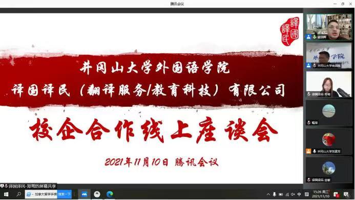经过前期多次沟通与协商,11月10日下午,我院与译国译民翻译公司(福州)校企合作线上座谈会如期举行。学院院长袁邦株、译国译民翻译公司总经理俞剑辉、高校事业部总经理郑莺出席会议,学院翻译学科组全体成员参加。