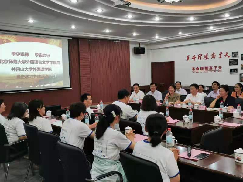 为庆祝中国共产党成立100周年,7月3日下午,我院与北京师范大学外文学院在井冈山开展“学史崇德,学史力行”两院党史学习共建活动。北师大外文学院院长苗兴伟教授一行及学生党员代表,我院党政领导班子、系部负责人、专业负责人及师生代表共计30余人参加活动,活动由我院党委书记胡闽华主持。