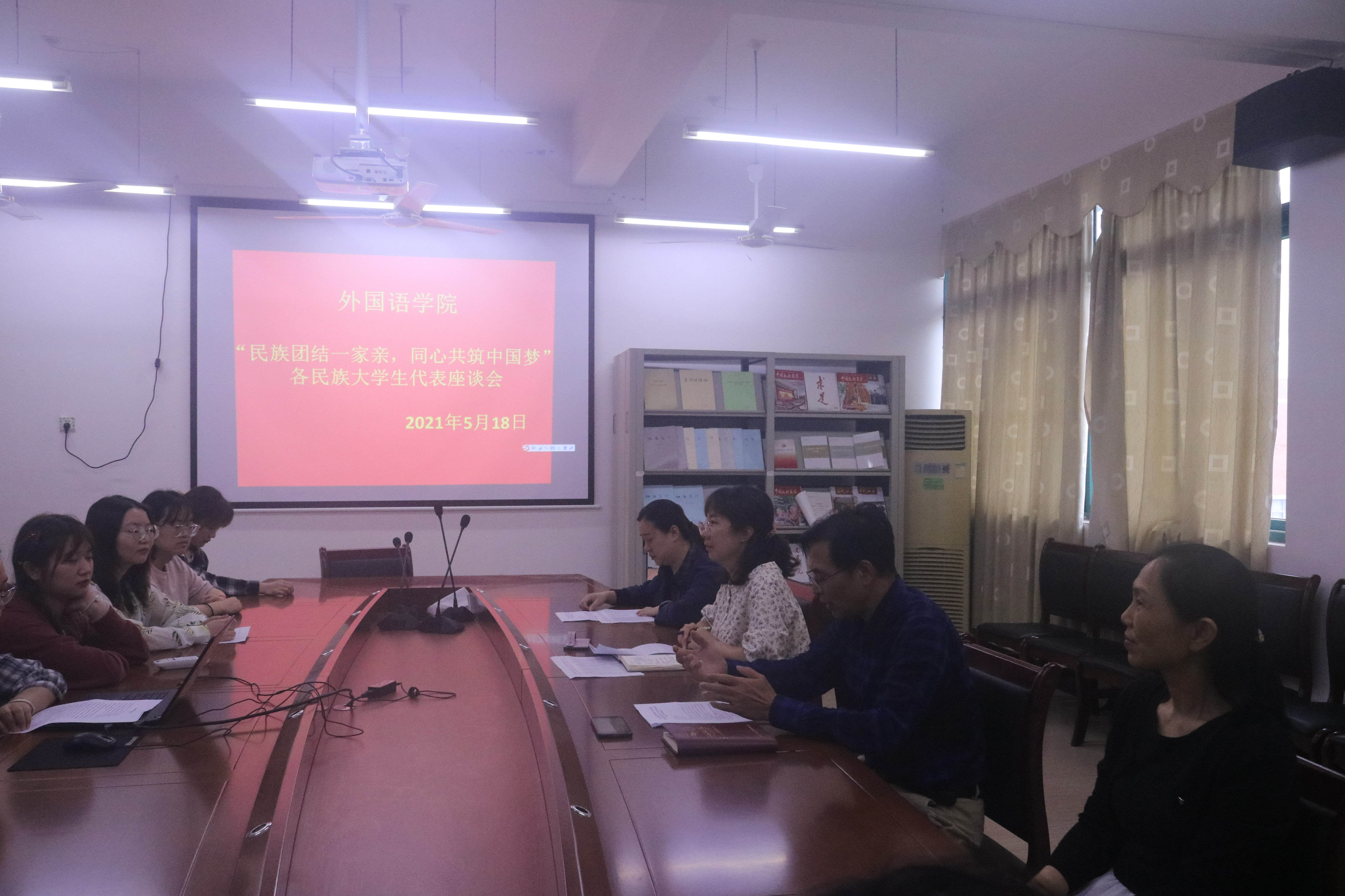 为铸牢中华民族共同体意识,进一步加强各民族学生之间的交流,5月18日下午,外国语学院召开“民族团结一家亲,同心共筑中国梦”各民族大学生代表座谈会。院党委书记胡闽华等出席,各科室负责人、学院全体少数民族学生、汉族学生代表参加座谈会,党委副书记李明敏主持。