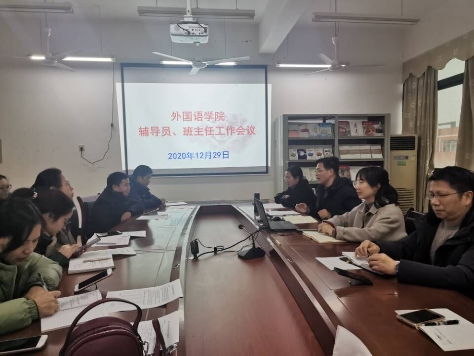 12月29日下午,外国语学院在党员活动室召开辅导员、班主任工作例会,学院党委书记胡闽华、院长袁邦株出席并讲话,全体辅导员、班主任参加了会议。会议由党委副书记李明敏主持。