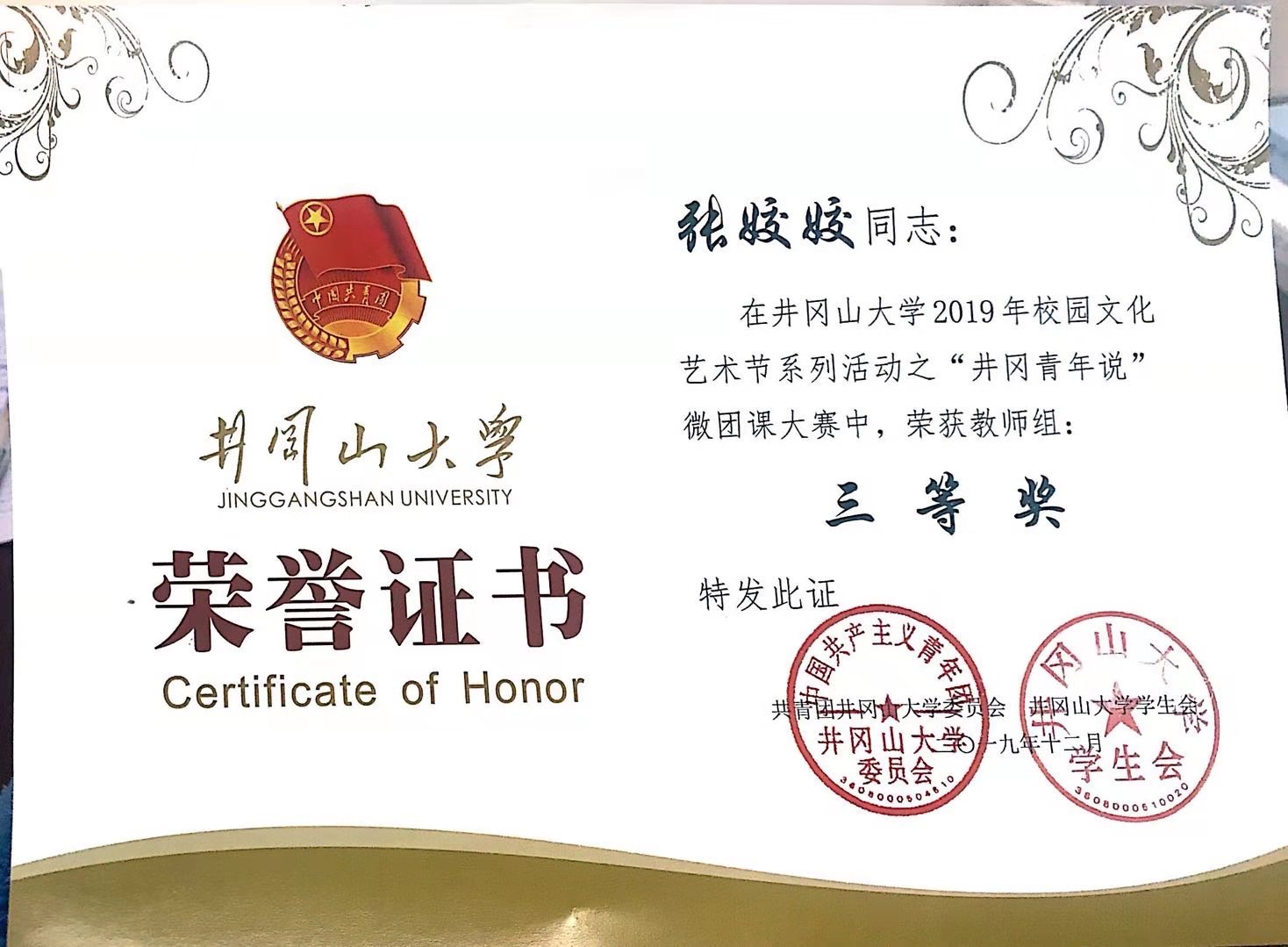 喜报 2019年12月20日 学院新闻 最近在学校举办的各项活动中,我院教师不畏强手,积极参与,取得了好成绩,在井冈山大学校园文化艺术节中,张姣姣获“井冈青年说”微团课大赛三等奖,学院荣获“我和我的祖国”庆祝新中国成立70周年知识竞赛二等奖,同时荣获校园文化艺术节优秀组织奖;在大学生就业创业理论研究论文大赛中,郭检生获一等奖,周溪获三等奖;在井冈山大学第七届辅导员素质能力大赛中周溪获三等奖。 分享到:QQ好友微信QQ空间新浪微博人人网复制网址打印