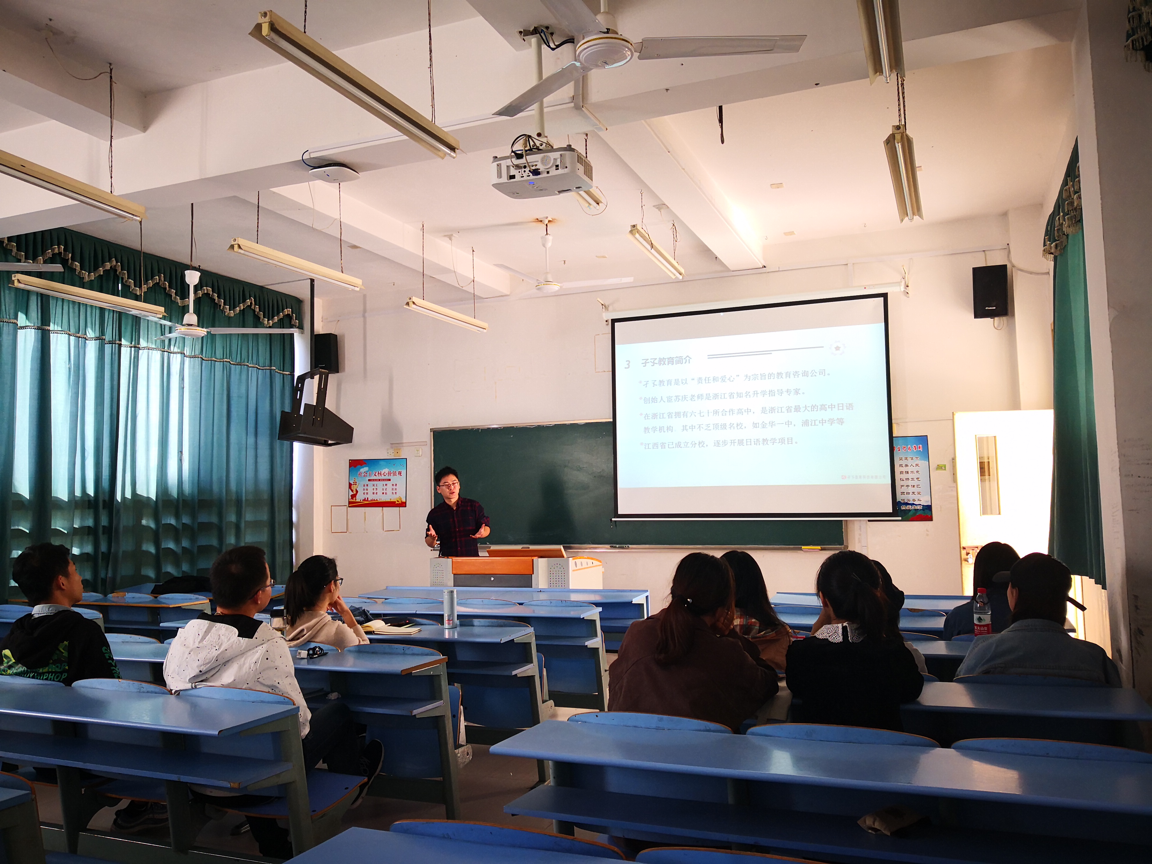 10月31日下午,杭州孑孓教育科技有限公司在9栋201教室召开专场招聘会,孑孓教育江西区域总经理王帅到场进行了招聘宣讲,学院2020届日语专业毕业生参加了此次招聘会。