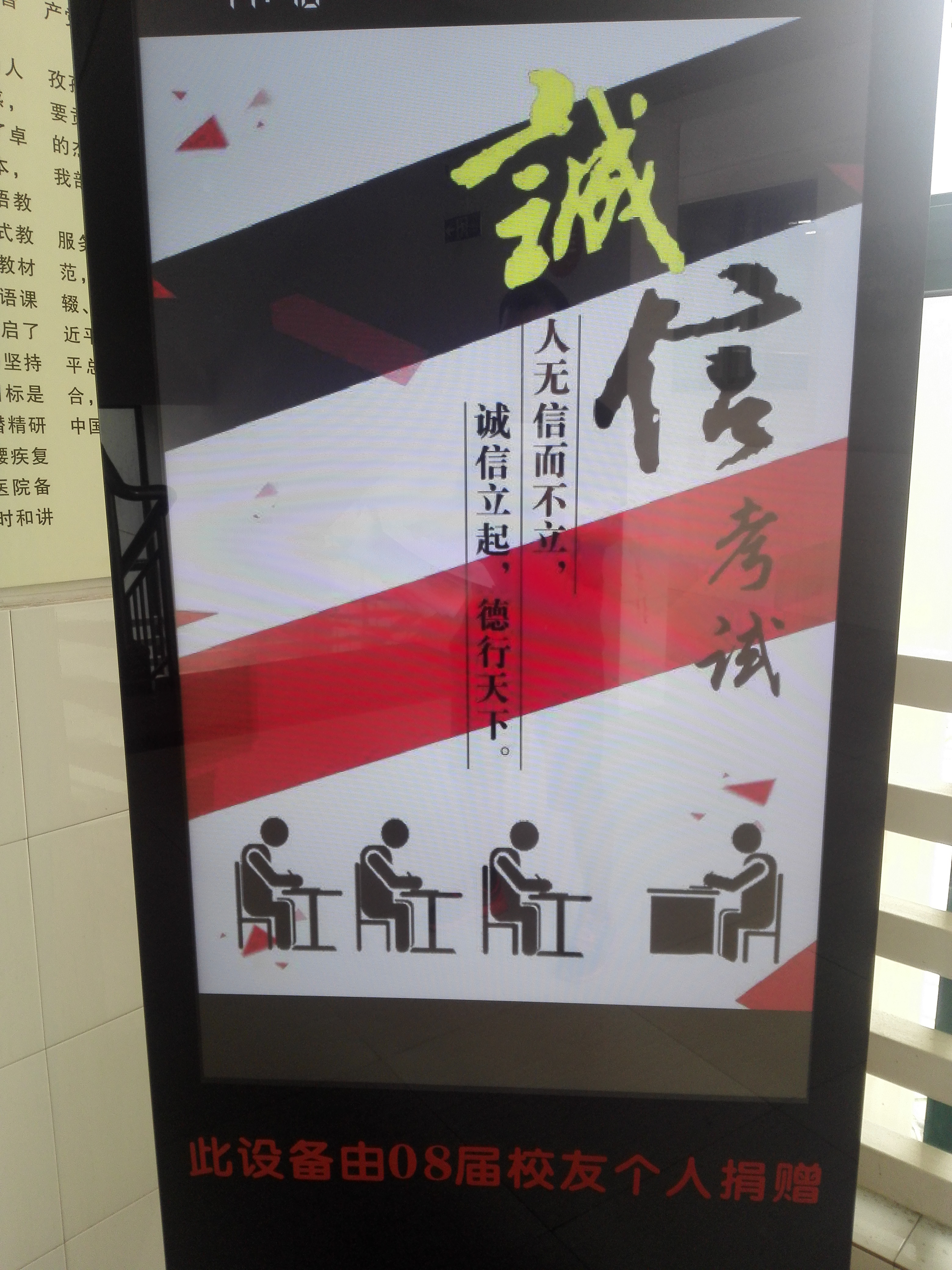 期末考试即将来临,为了强化对学生考风考纪的教育,动员学生认真复习,诚信考试,加强考试违纪警示教育,营造公平诚信的考试氛围,学院于近日起利用校友捐赠的“仙视显示屏”滚动播放诚信应考、拒绝作弊的宣传精品和公益广告,图文并茂,提前营造“端正考风诚信考试”的浓厚氛围。