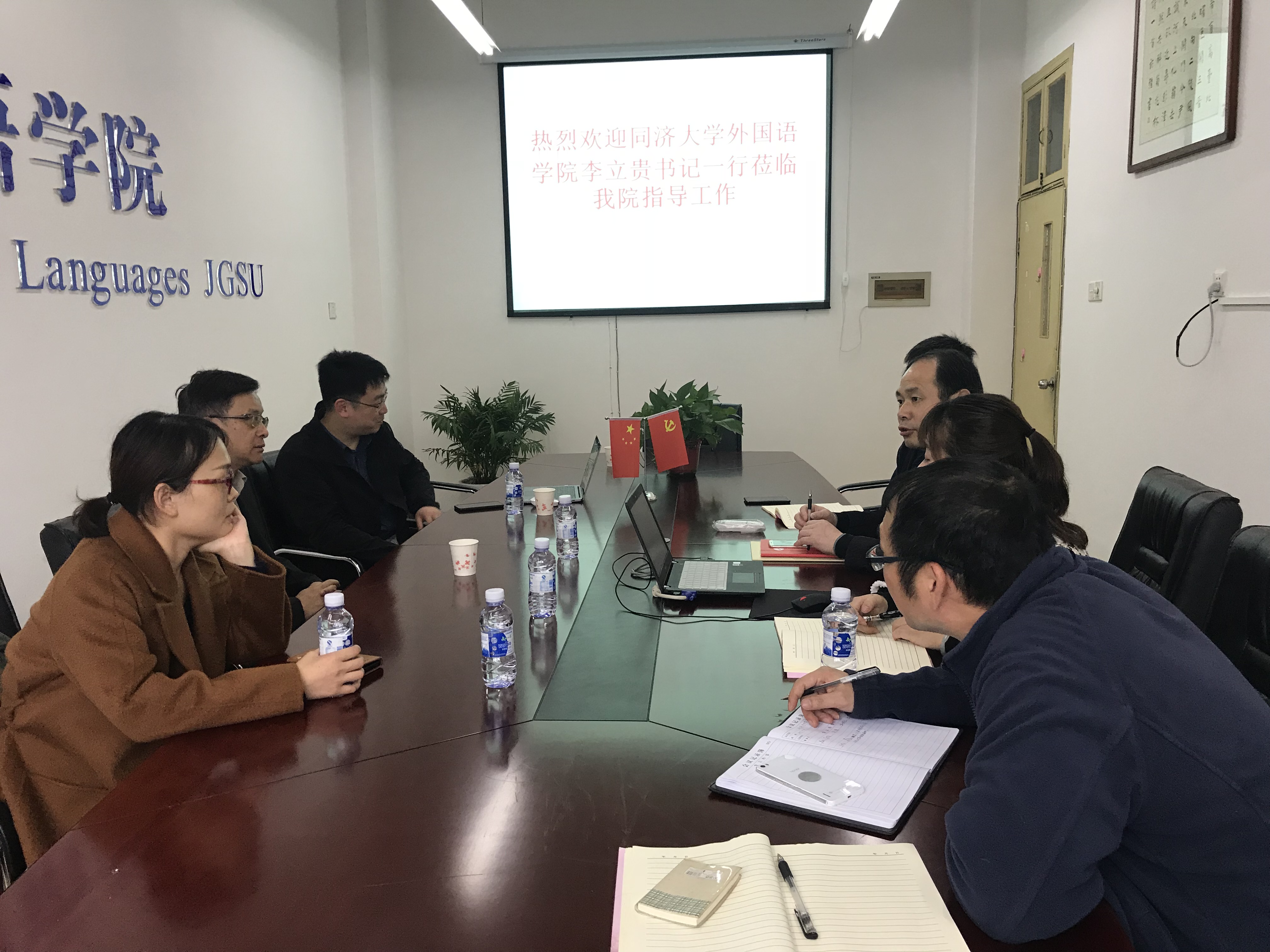 4月18日下午,同济大学外国语学院党委书记李立贵、党委副书记徐伟铖一行3人,在9栋4楼会议室,就党建、学生教育管理等工作与我院进行座谈交流。学院党委书记马于强、党委副书记林君和学生科全体人员参加了座谈会。