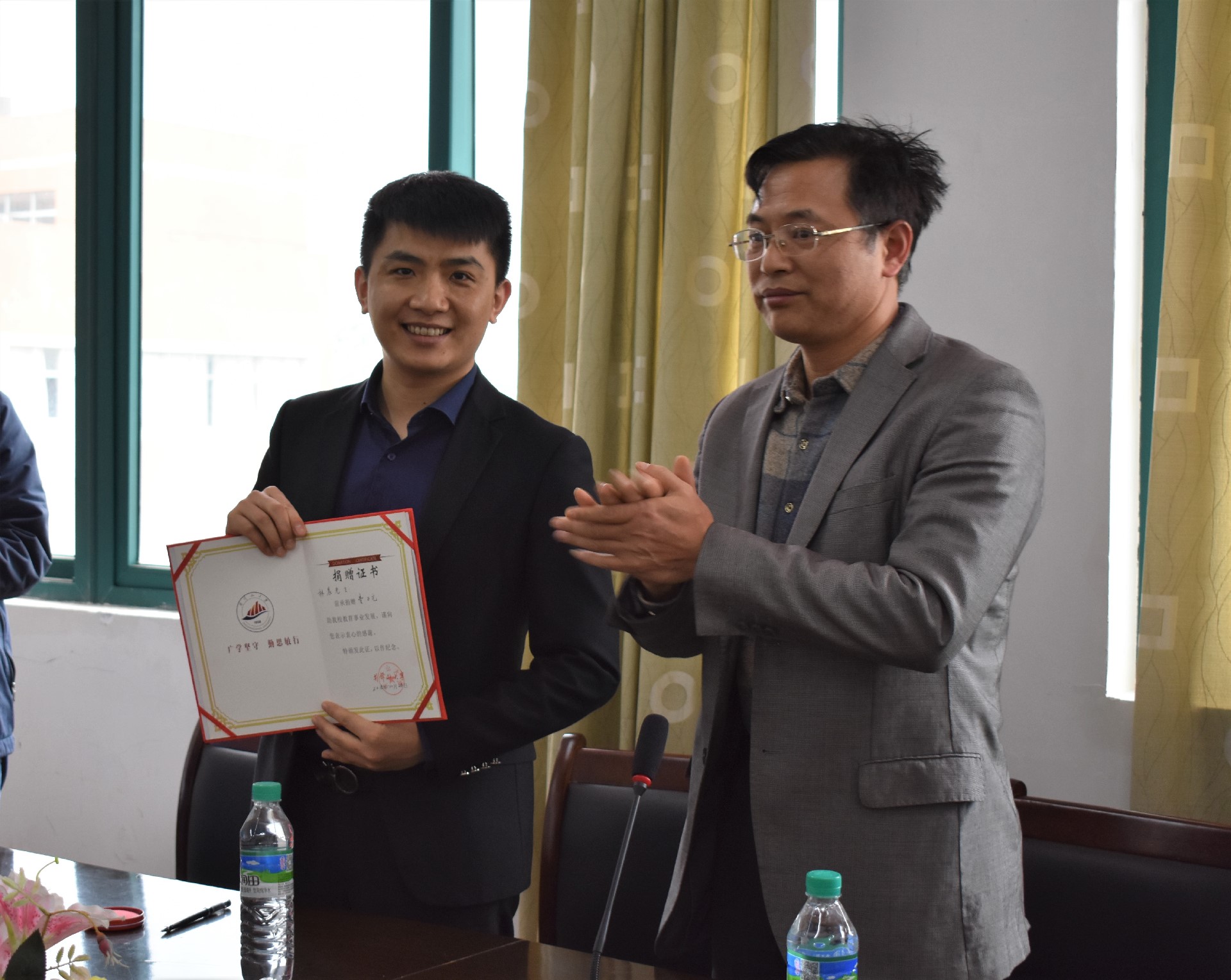 周溪简要介绍了优秀校友林晨在学院设立奖学金的目的与意义,宣读了协议内容。林晨和李明敏互签资助协议,随后,李明敏向林晨颁发了证书。林晨与参加签约仪式的团学干部们进行交流。他以亲和的态度谈及自身的工作经历,以及当年宝贵的团学工作经历,同时鼓励学弟、学妹们在学业上要更上一层楼,做一个有所谓、有作为的新时代大学生。