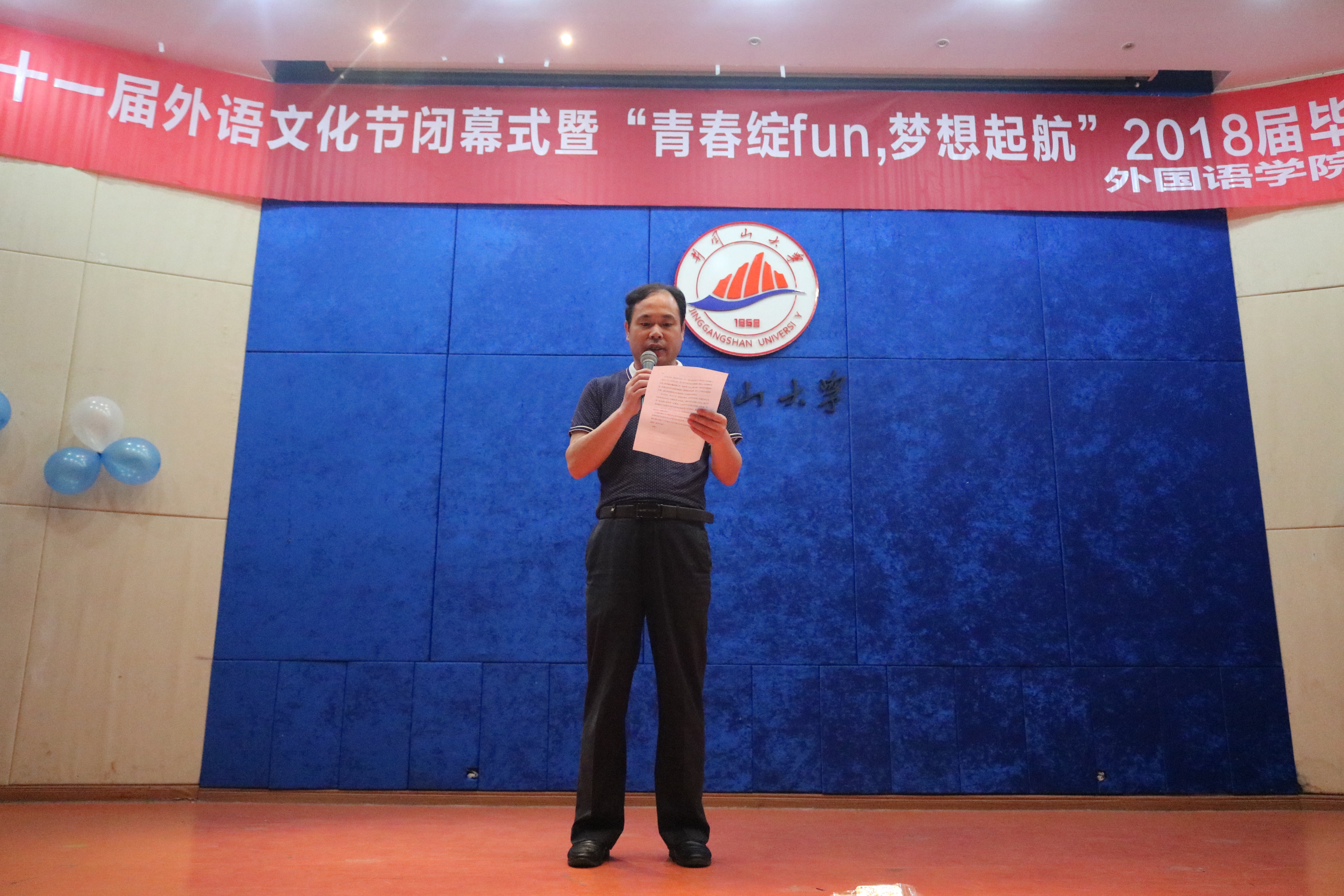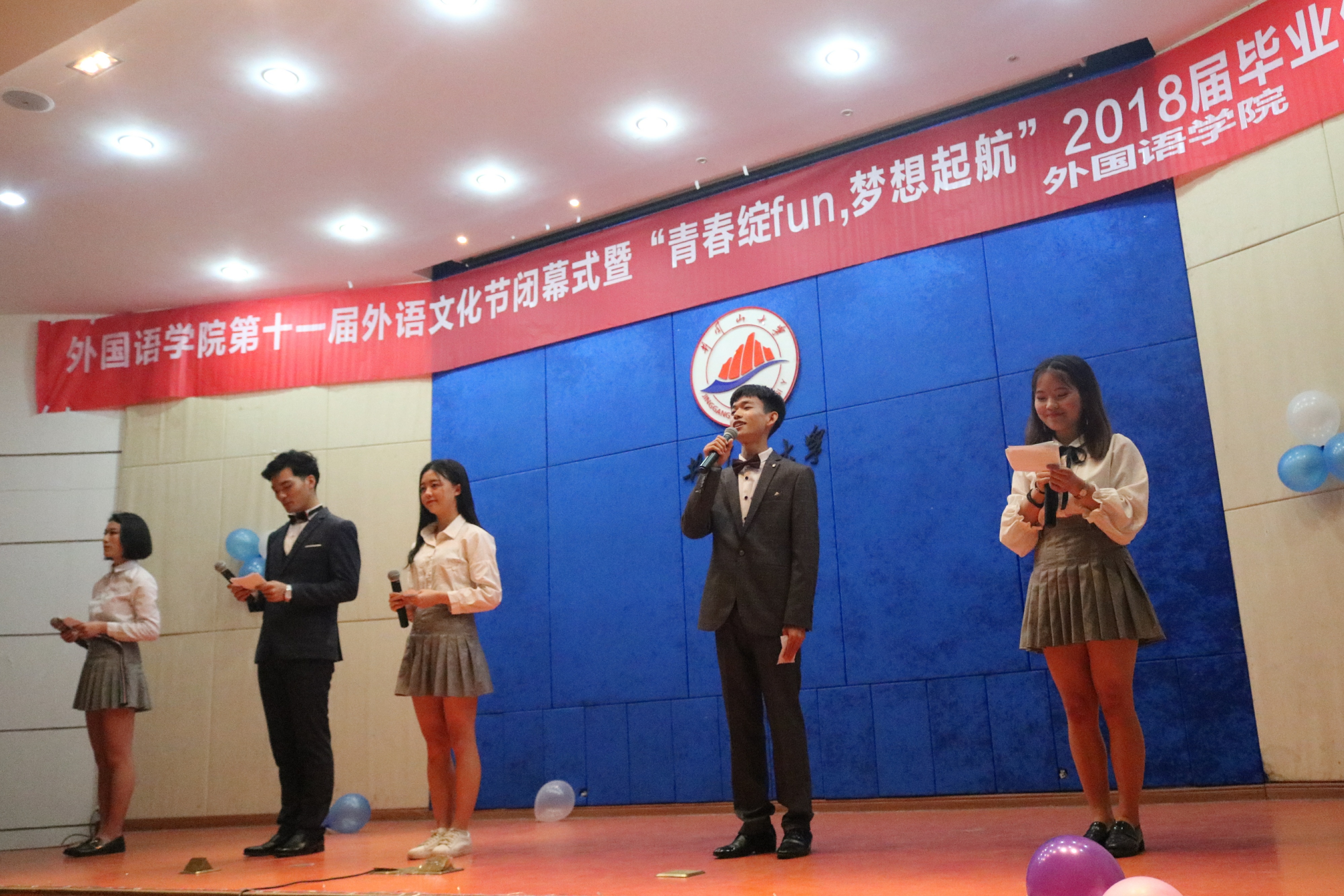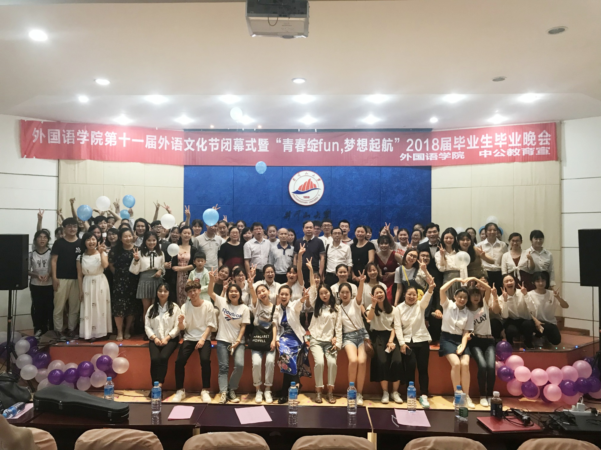 学院第十一届外语文化节闭幕式暨“青春绽fun,梦想起航”2018届毕业晚会圆满结束 2018年05月21日 团学活动 5月19日晚,学院第十一届外语文化节闭幕式暨“青春绽fun,梦想起航”2018届毕业晚会在十栋学术报告厅举行。 学院党委书记马于强致辞。随着开场舞的进行,毕业晚会也正式开始!妩媚柔美的十三钗;悦耳欢快的德语合唱;幽默富有意义的小品;激情飞扬的拉丁舞;动感温馨浪漫的歌曲串烧;高雅不同凡响的大提琴演奏;天真可爱又不失内涵的小王子;活力又感人的青春纪念册……一个又一个精彩的节目在观众前呈现,令人应接不暇,回味无穷。 随着此次晚会的结束,时长一个月的第十一届外语文化节也由此落下了帷幕。 分享到:QQ好友微信QQ空间新浪微博人人网复制网址打印
