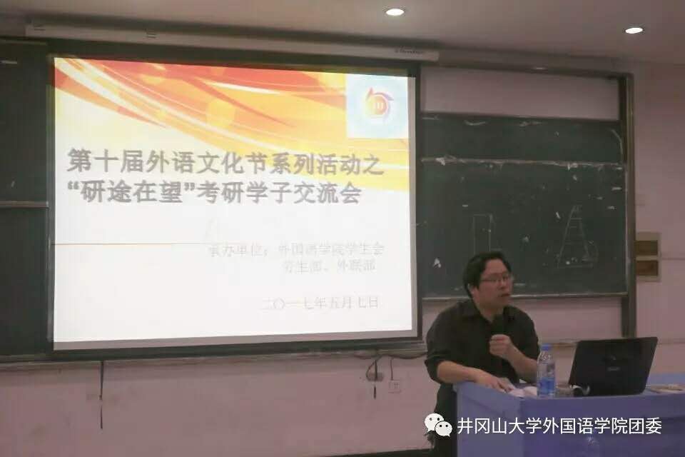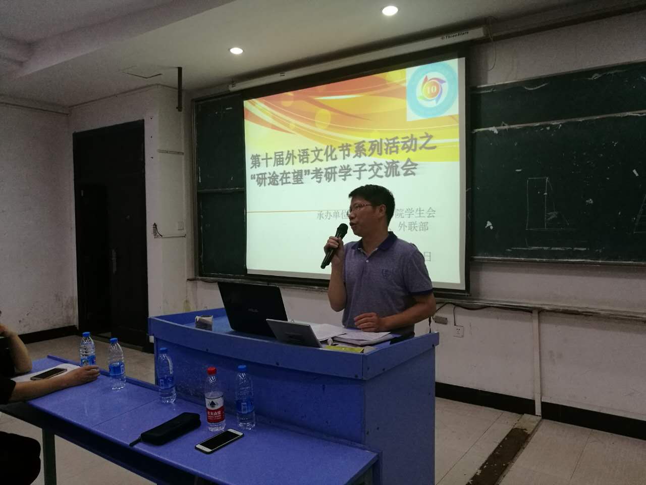 5月7日晚,学院在9栋309教室成功举办第十届外语文化节系列活动之“研途在望”考研学子经验交流会。学院院长袁邦株教授到会并作讲话,学院资深考研指导老师尹根德教授作2018届毕业生考研动员,交流会由学院学生科科长林君主持,学院2018届有考研意向同学参加了交流会,会场座无虚席。