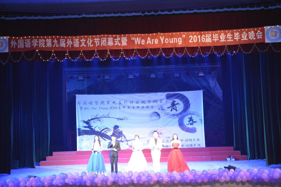 5月23日晚,学院第九届外语文化节闭幕式暨“We are young”2016届毕业生毕业晚会在学校学生会堂隆重举行。出席闭幕式和晚会现场的有吉安市人大常委会副主任、原外国语学院院长韩晓方教授,外国语学院党委书记马于强,副院长袁邦株教授,党委副书记张清华,副院长康旭平教授,学院各系部教师代表及学生近千人观看了晚会。