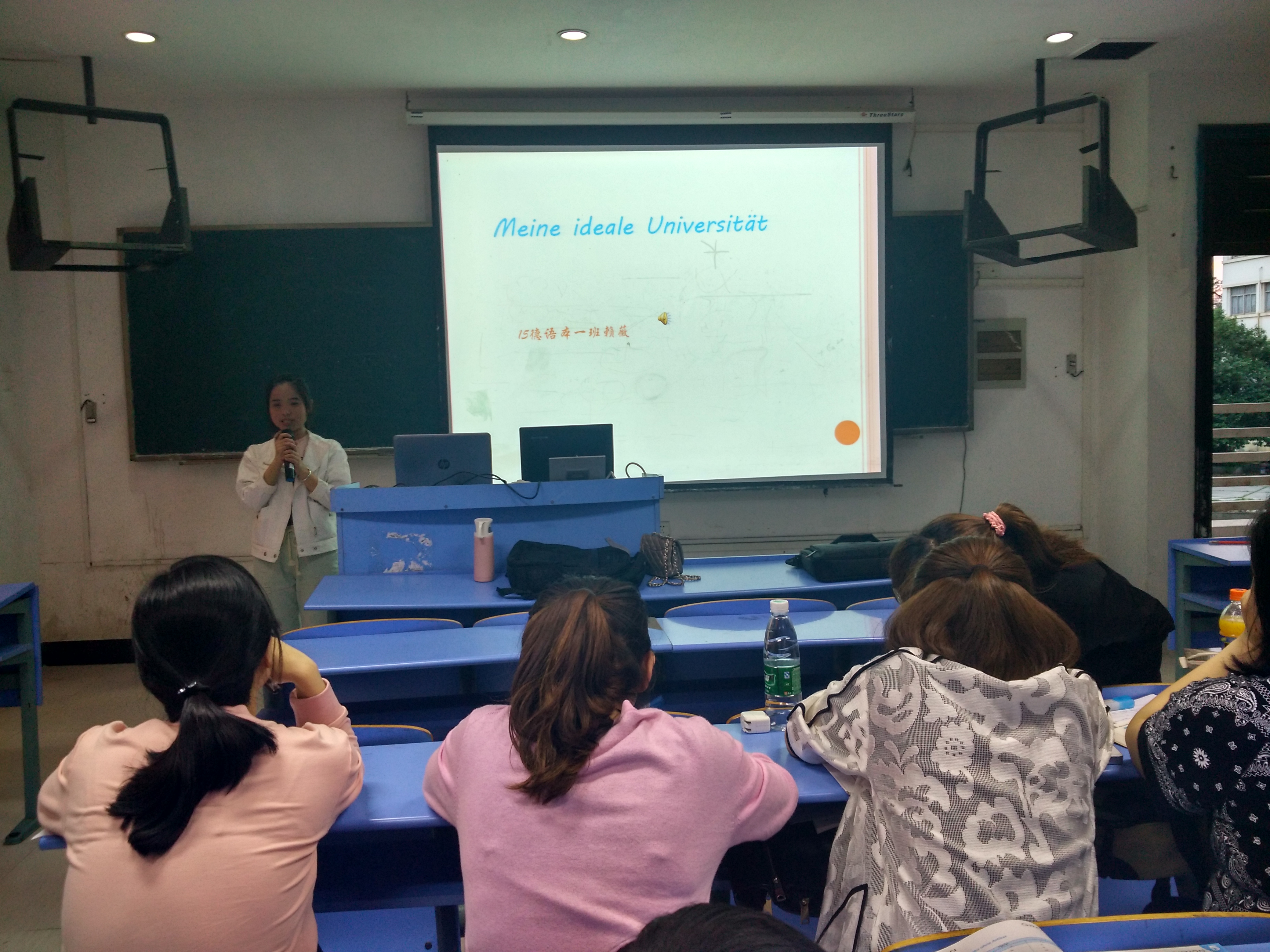 本次比赛演讲主题自选,简单的自我介绍后,选手们用精美的ppt和背景音乐展现自己的演讲。他们同时使用肢体语言加强演讲效果,生动地展现出自己的观点。对大学的憧憬,对美好爱情的向往,对各国风情的介绍等,最后14德语本一班六位同学包揽一二三等奖,15级选手虽然经验不足,但表现也毫不逊色,共有三人获得优秀奖。