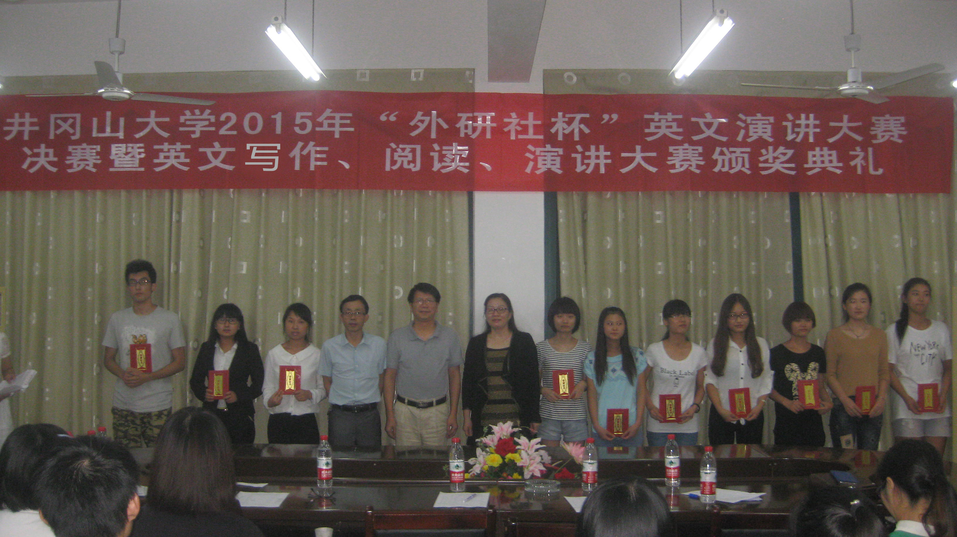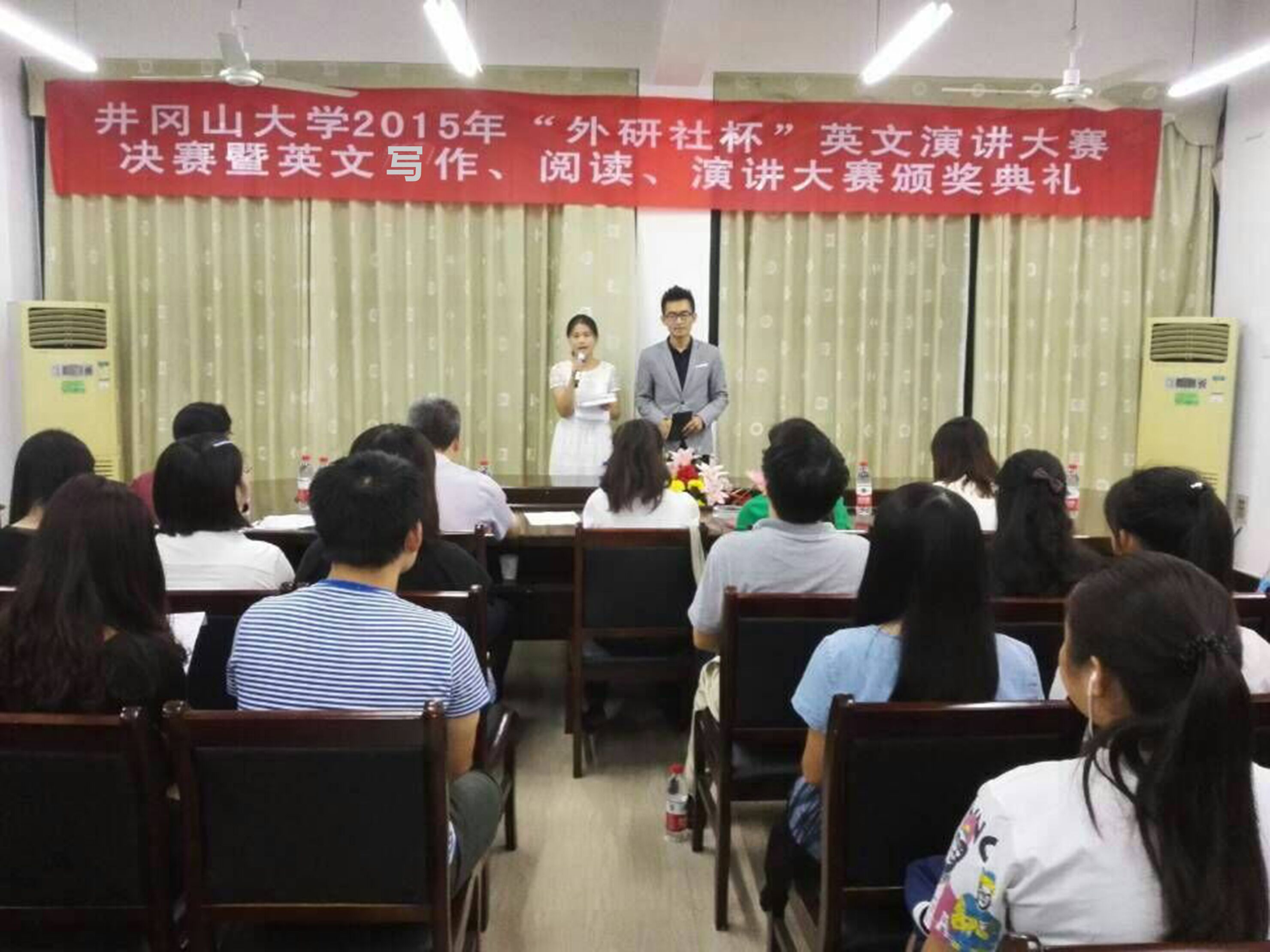 9月28日晚7点,井冈山大学2015年“外研社杯”英文演讲大赛决赛暨英文写作、阅读、演讲大赛颁奖典礼于九栋5楼会议室举行。