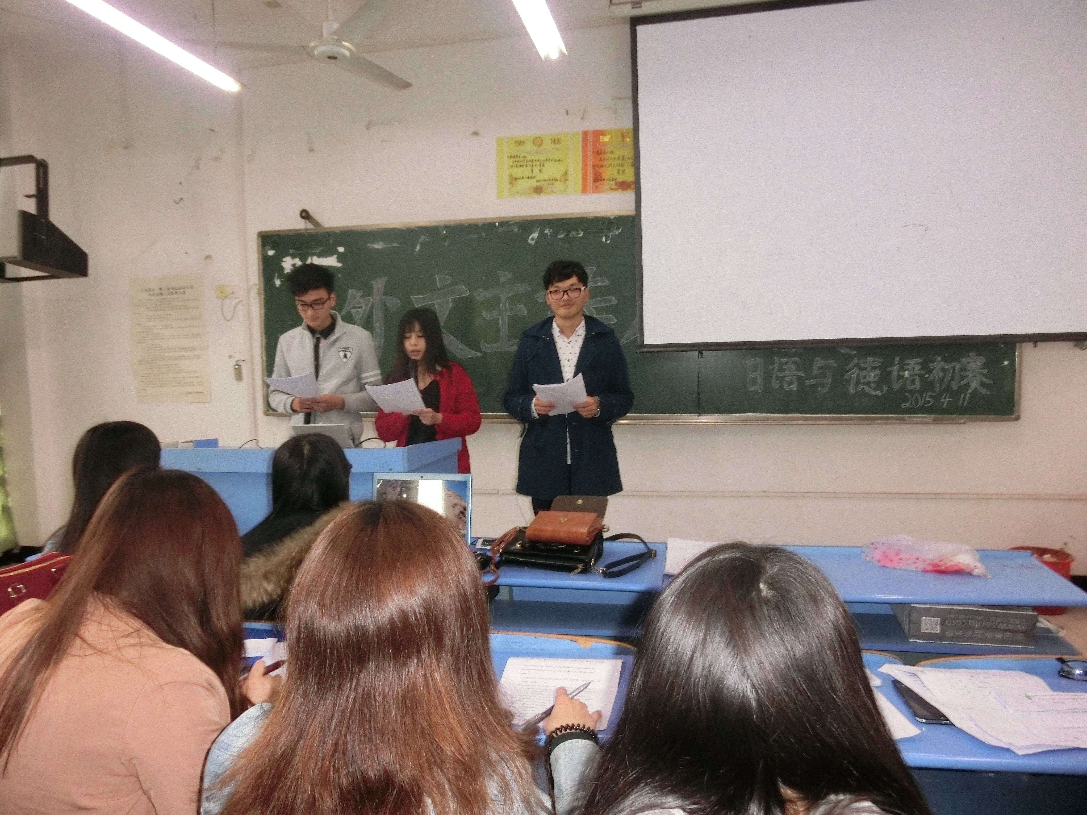 进入主持实战模拟,选手们展示了不同风格的主持方式,正式的人物访谈,激昂的体育播报,或是新鲜的八卦新闻,其内容既有当下十分流行的“中国梦”,更有备受追捧的话题“何以笙箫默”等等。使在场观众为之惊叹,时时掌声雷动。我院“驰骋青春,话统梦想”主持人大赛初赛分中、英、德、日4组语种进行初赛,经过4月7日中文组和英文组激烈的角逐,中英各有3组进入决赛。4月11号德语和日语组的比赛则分别决出2组和3组进入到决赛。5月19日晚第八届外语文化节开幕式暨“持骋青春,话筒梦想”外语主持人比赛的决赛将由这11组优秀的选手带来一场主持视听的大餐,我们拭目以待。