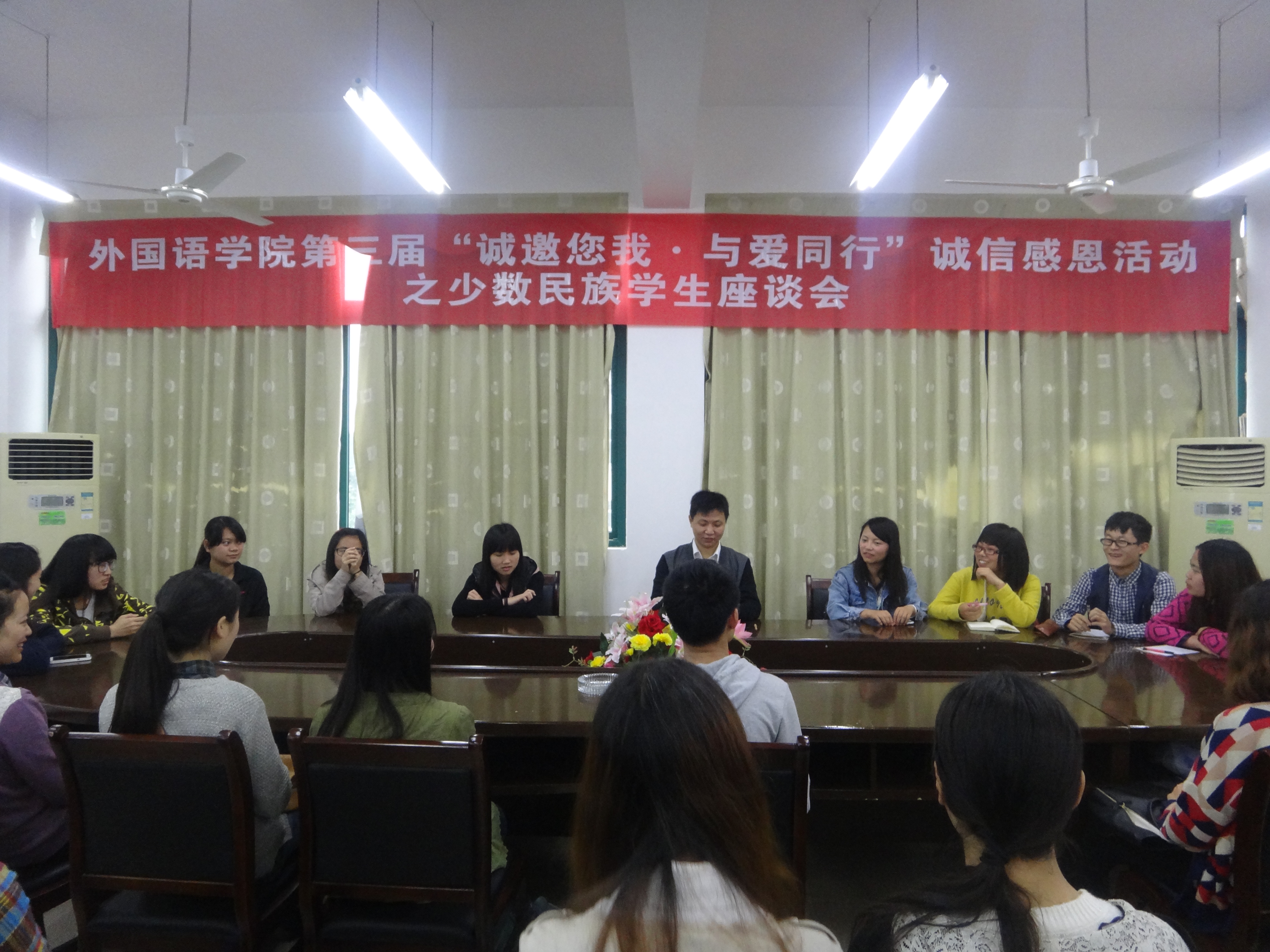 4月24日下午,外国语学院第三届“诚邀你我·与爱同行”诚信感恩教育活动之少数民族座谈会在9栋5楼会议室举行,30多名来自学院各专业的少数民族学生代表参加了本次座谈会。