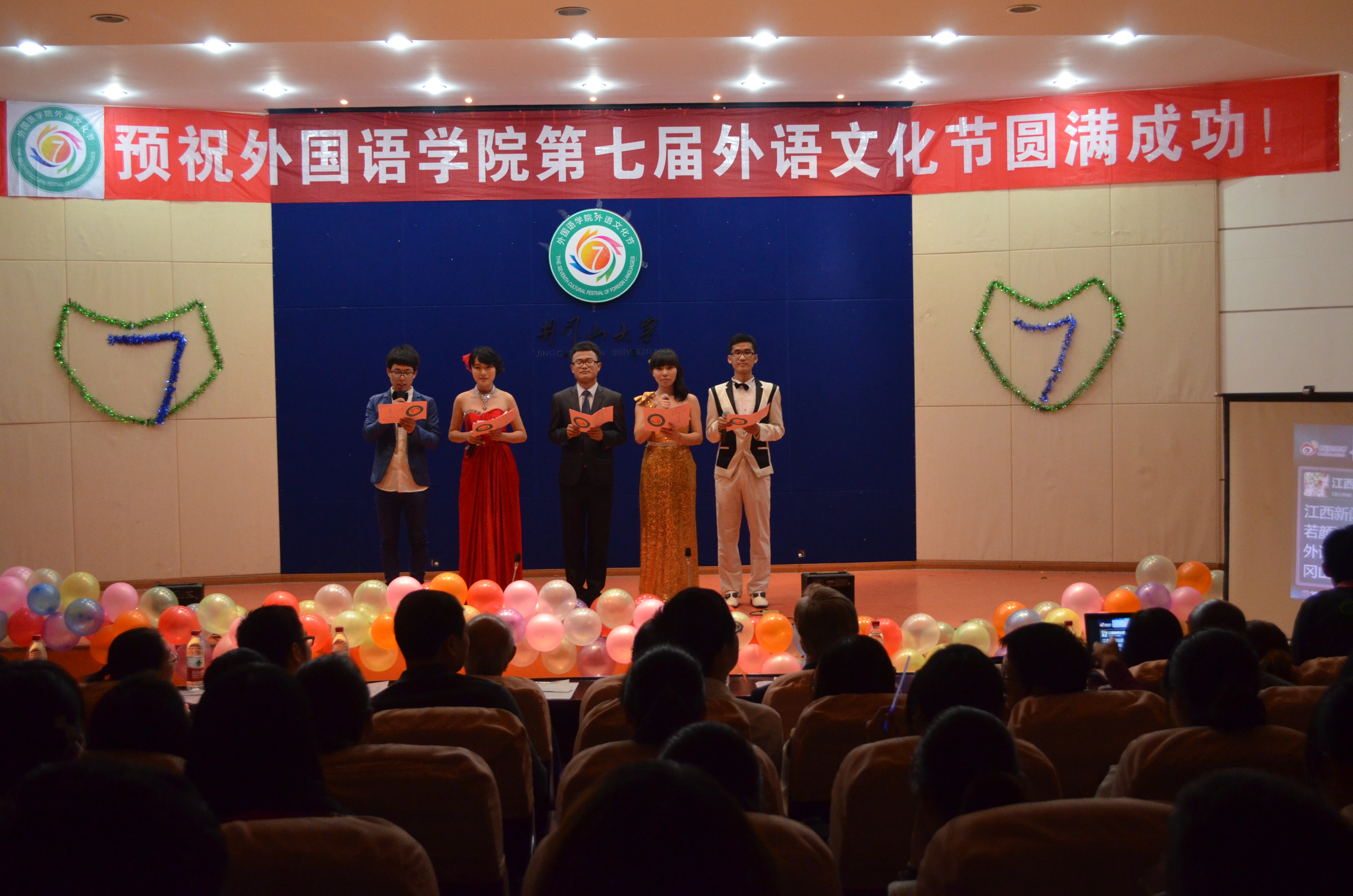 为深入学习贯彻党的十八大及十八届三中全会精神,进一步加强学院学风建设,活跃学生第二课堂,激发学生学习外语的热情,培养学生的创新意识和提高学生的外语综合运用能力, 4月20日晚,外国语学院第七届外语文化节开幕式在十栋学术报告厅隆重举行,出席开幕式的嘉宾有井冈山大学团委书记李泉,外国语学院党政班子成员,学院师生近400人参加。