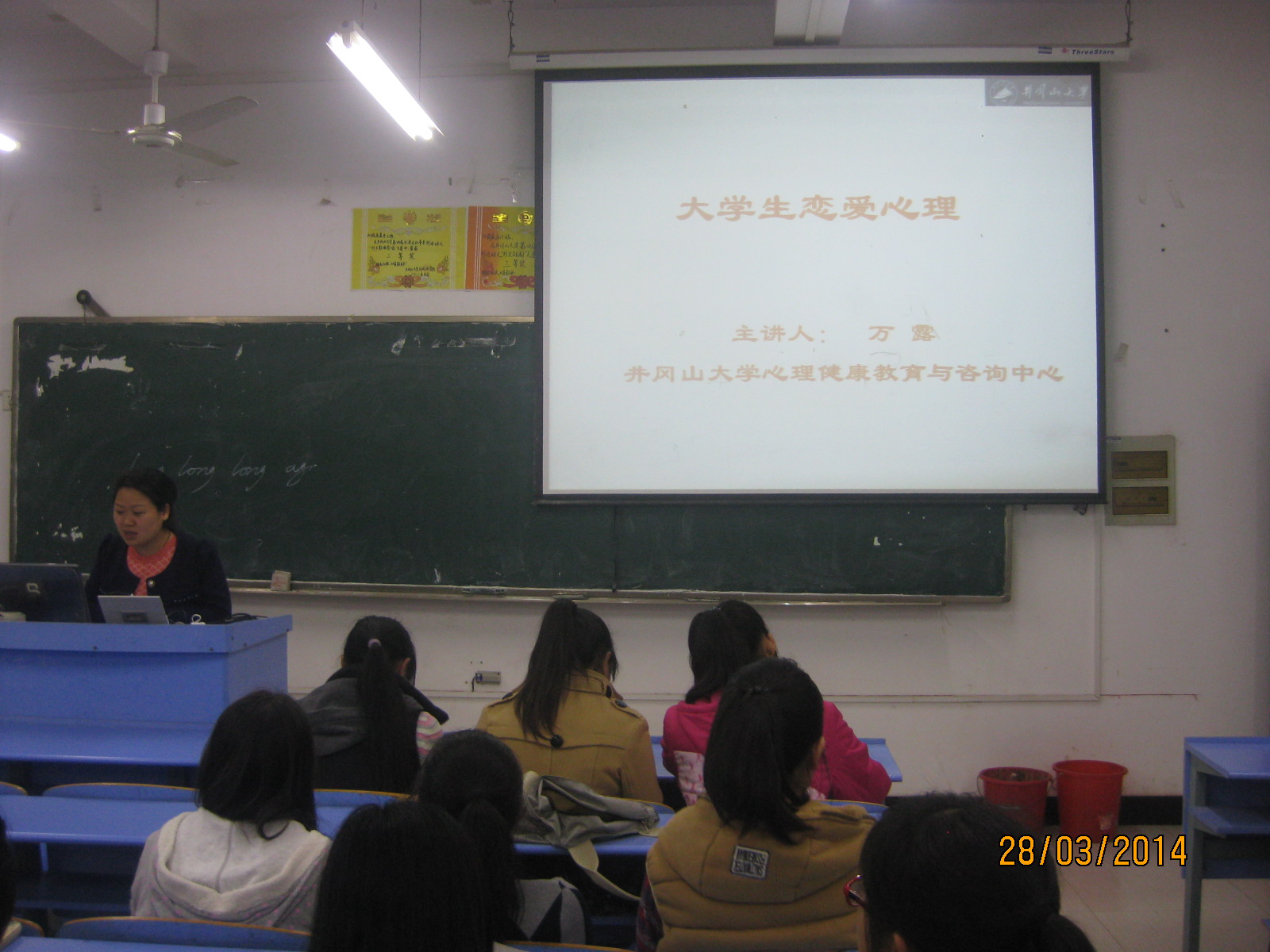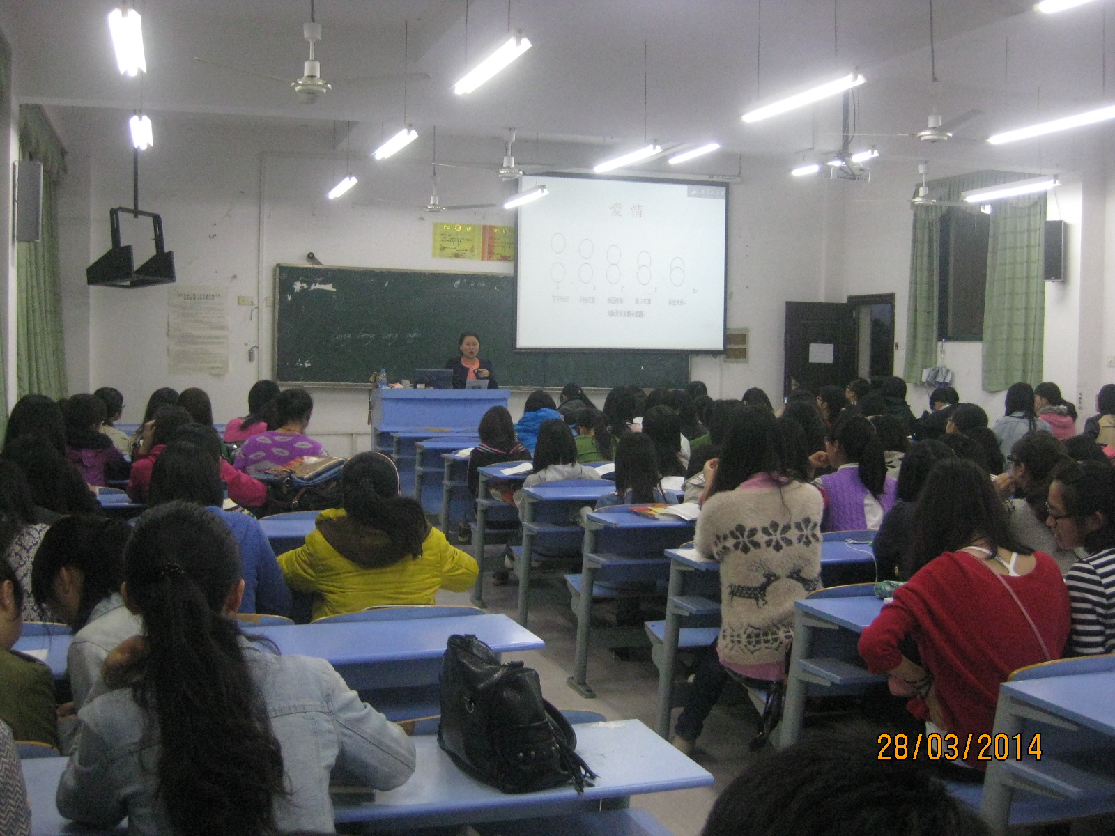 3月28日晚6点30分,外国语学院举办的第三场大学生心理健康知识讲座在9栋307如期举行,本次讲座由学校心理健康教育与咨询中心的万露老师主讲,学院13级的全体学生的参加。讲座由13级辅导员陈丰老师主持。