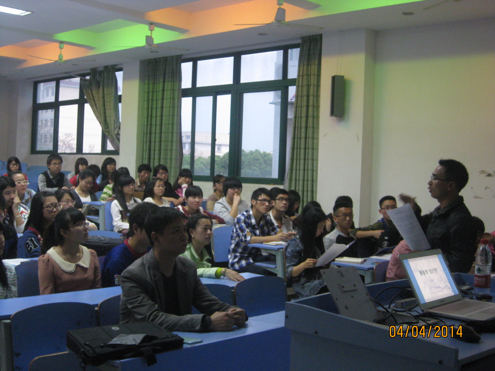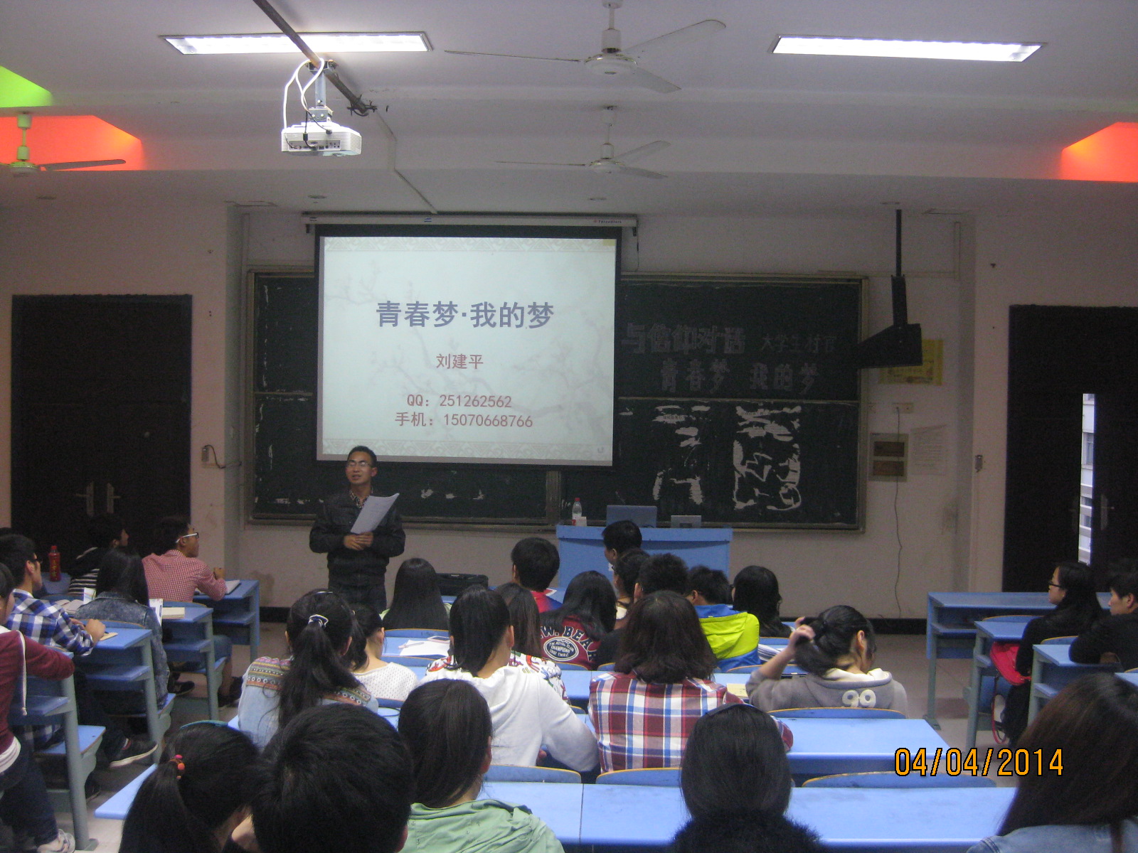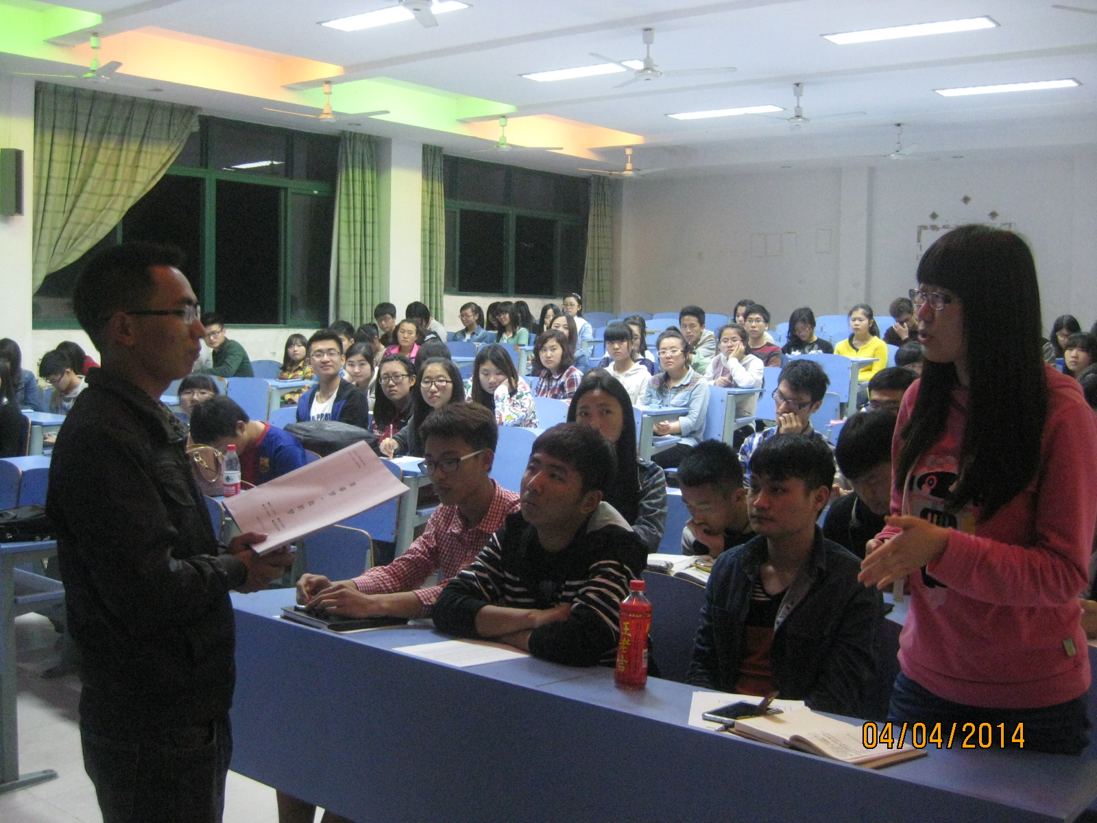 2014年4月4日晚,外国语学院在9栋409教室举办了青马工程第二次讲座,本次讲座由永丰县富裕村大学生村官刘建平主讲。出席本次青马工程讲座的有外国语学院学生科科长林君和副科长周溪,参加本次讲座的有外国语学院全体学生干部以及部分学生党员。