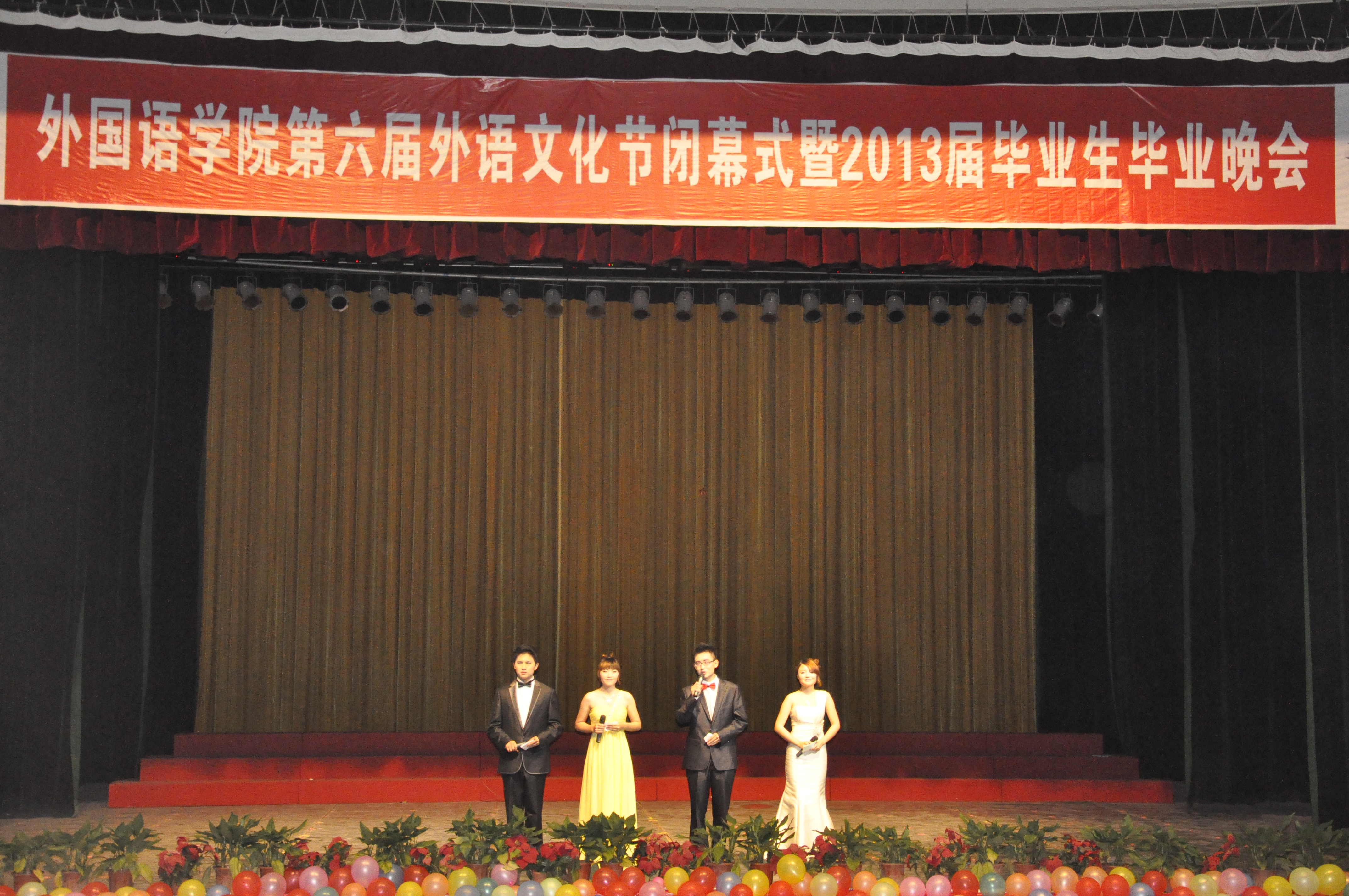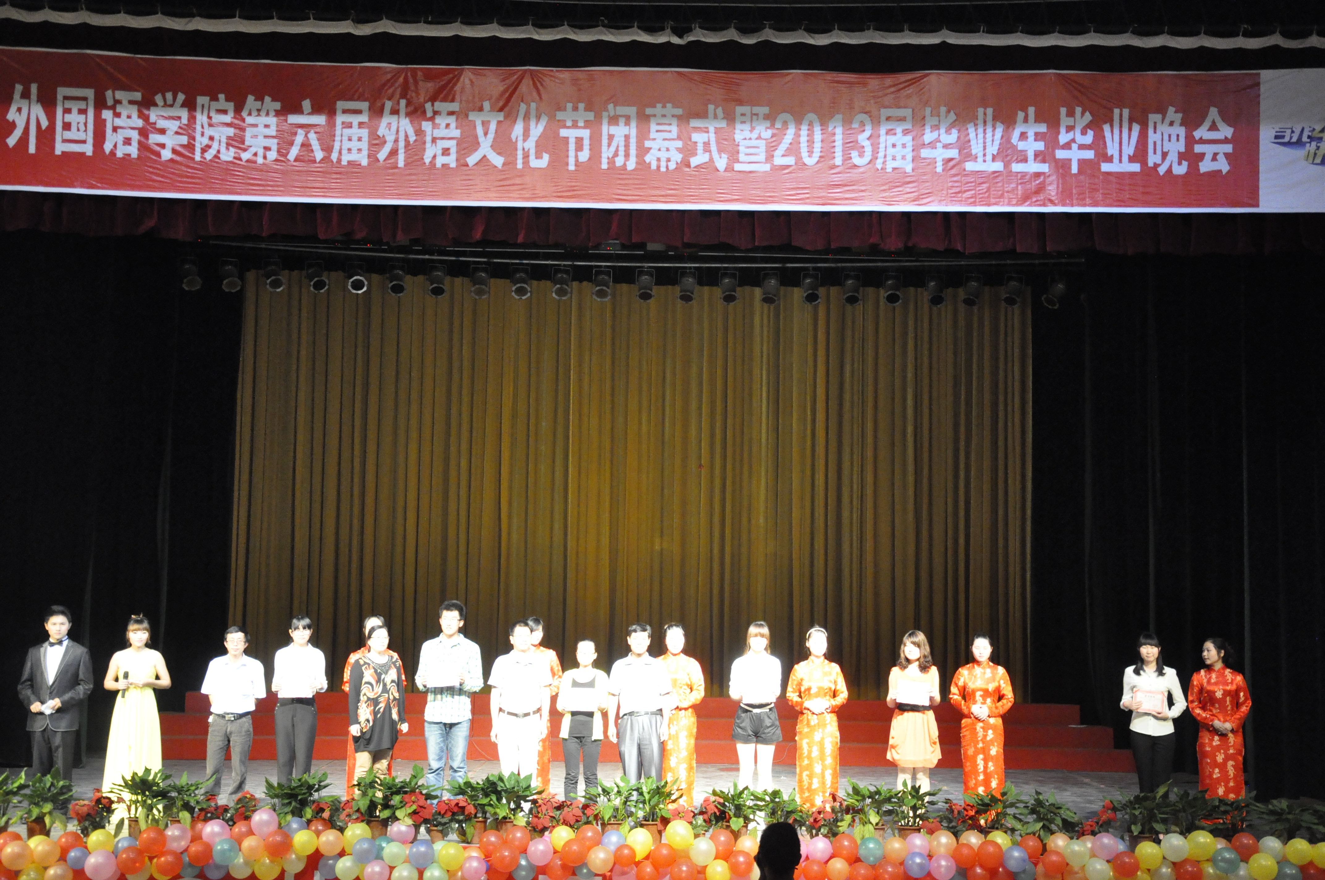 外国语学院第六届外语文化节闭幕式暨2013届毕业生毕业晚会于5月21日晚7点在学生会堂隆重举行。外国语学院党委副书记张清华,副院长袁邦株、陈小曼、康旭平等领导出席闭幕式并观看了本场晚会,并为在本届文化节各项比赛中获奖的集体和个人颁发了奖状和获奖证书。参加闭幕式的还有学院各年级辅导员、部分教师及我院全体学生,各兄弟学院同学也纷纷前来观看晚会,整个会堂座无虚席。