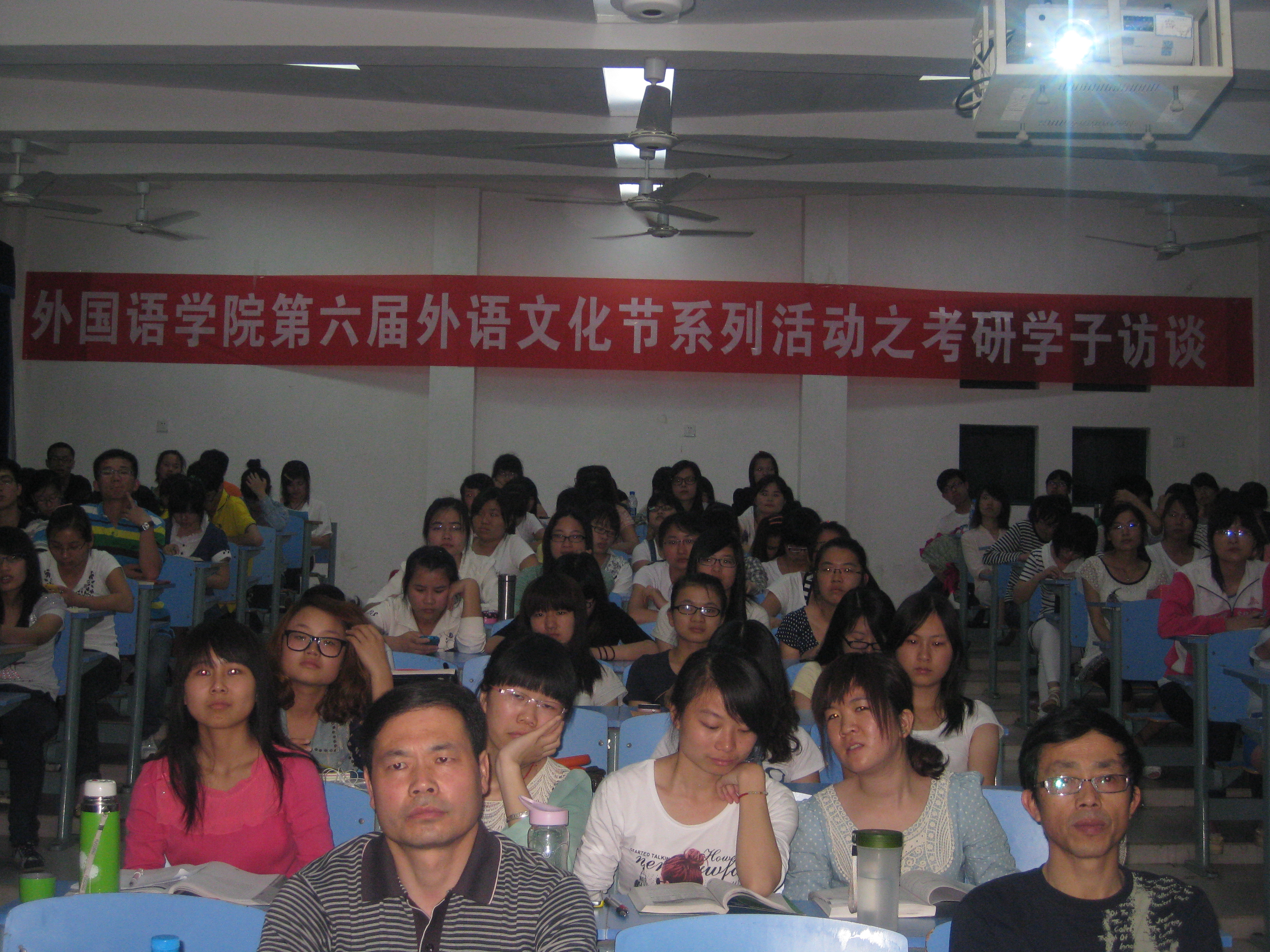 为增强学生对研究生考试形势的认识,帮助学生了解最新考研动态,5月12日晚上,外国语学院2013年考研经验交流暨2014年考研动员大会在9栋309栋教室顺利举行,学院领导、团委学生科负责人、辅导员、09级成功考研毕业生及低年级学生约200人参加了活动。